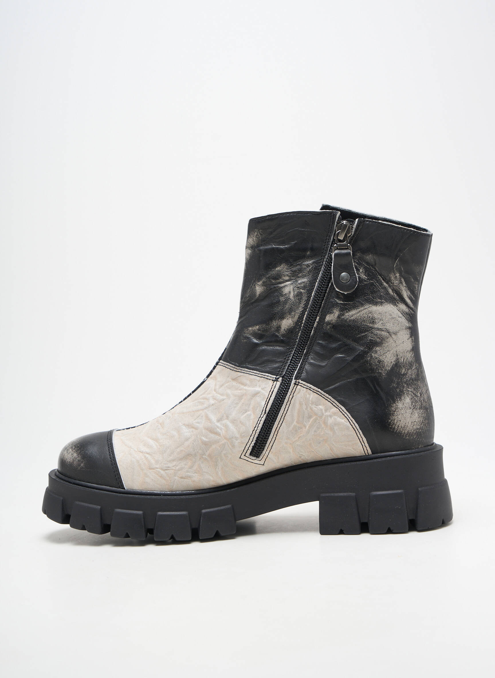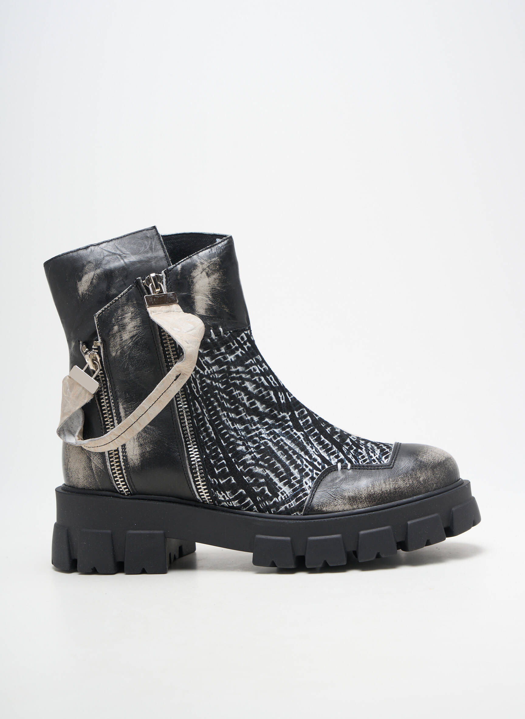 Voici l’occasion idéale de vous offrir des boots MACIEJKA OBUWIE tendance à prix réduit, parfaites pour affirmer votre style sans vous ruiner. Ce modèle femme séduit par son mélange de matières et de textures, alliant un cuir noir effet vieilli à des empiècements texturés graphiques qui attirent instantanément le regard. La semelle épaisse crantée assure une allure moderne et un confort de marche optimal, tandis que les détails de fermeture zippée ainsi que la bande contrastante apportent une touche d’originalité. Succombez à l’allure audacieuse de ces bottines tout en faisant une belle économie sur une pièce forte et actuelle.