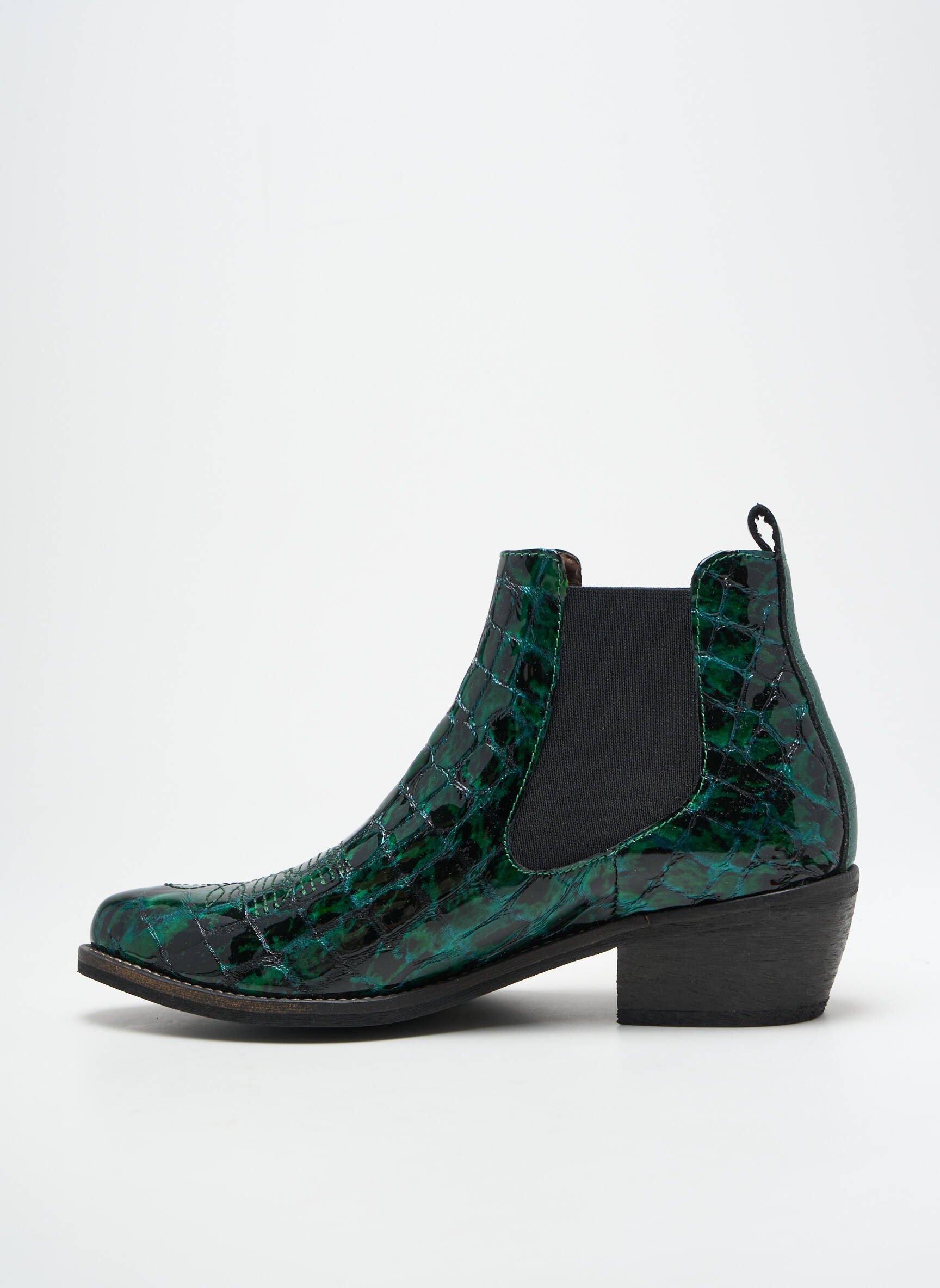 Profitez d’une occasion à ne pas manquer avec ces bottines femme signées MINKA DESIGN au look croco vert profond et noir, parfaites pour donner du caractère à toutes vos tenues sans vous ruiner. Leur silhouette Chelsea revisitée se distingue par un élastique latéral noir et un petit talon stable, pour mêler confort et style au quotidien, le tout à prix dégriffé.
