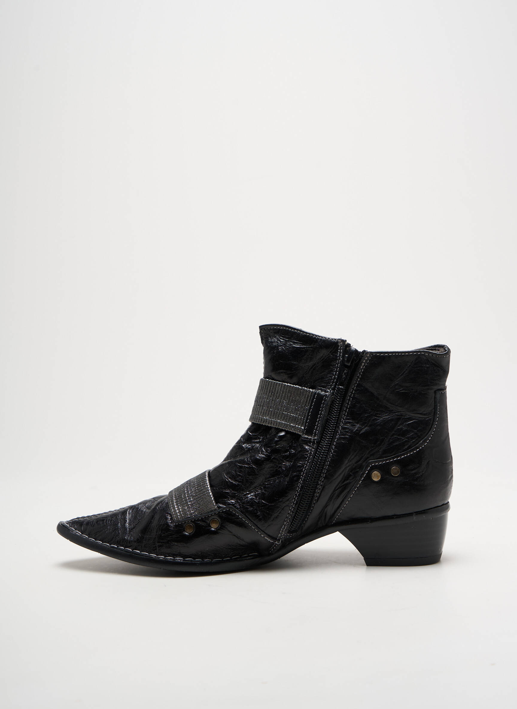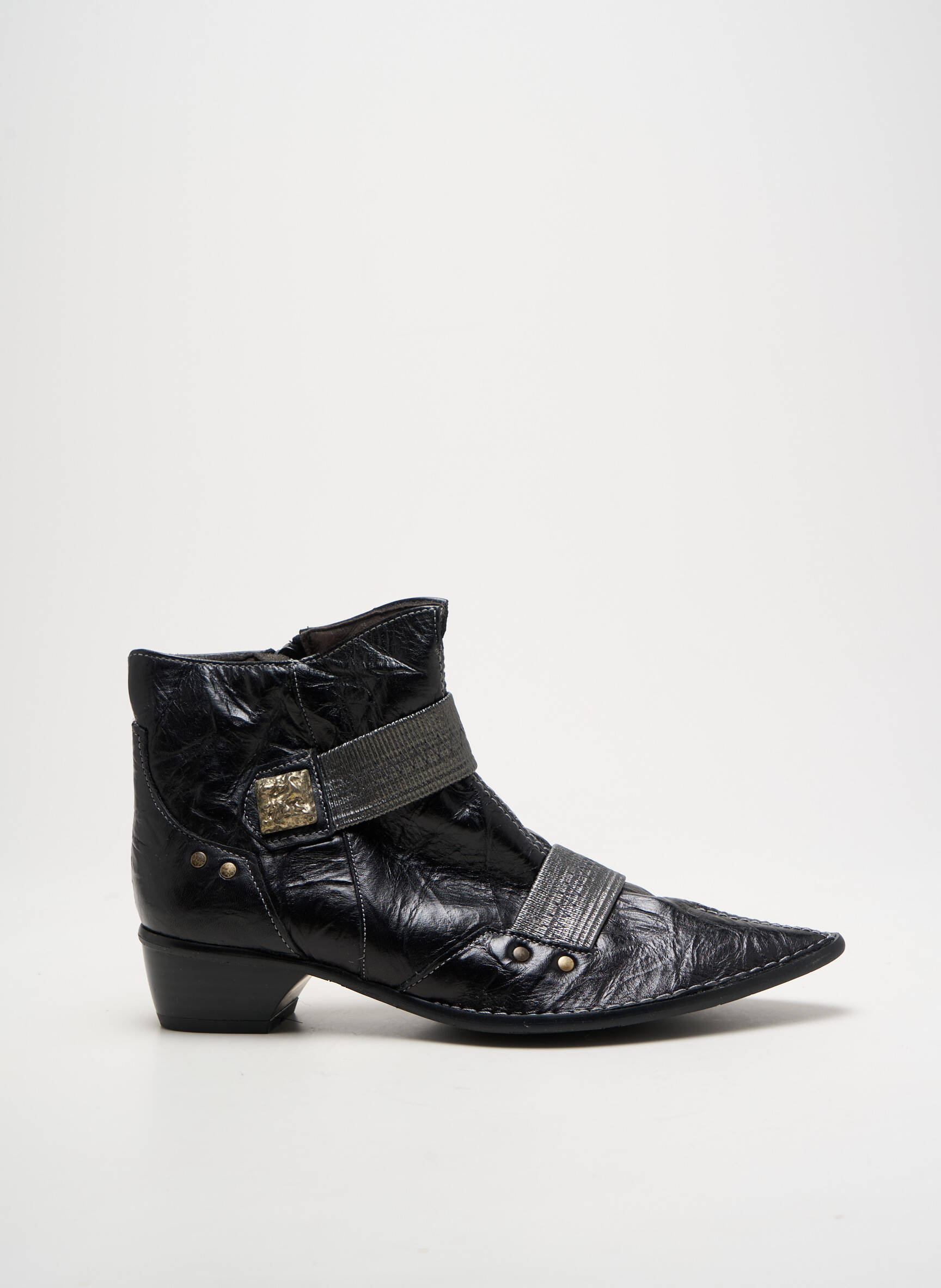 Craquez pour ces bottines POMARES VAZQUEZ au look résolument tendance, proposées à prix mini pour un vrai bon plan mode. Leur design original mêle un cuir noir au fini légèrement froissé et des brides croisées munies de détails métalliques, pour un style affirmé et une touche rock chic qui reflète parfaitement l’esprit des boots de créateur, le tout à petit prix pour faire rimer élégance et économie.