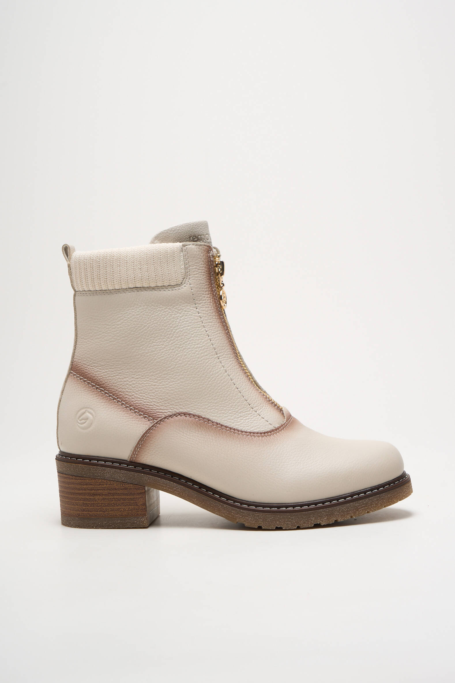 Profitez d’une offre exceptionnelle avec ces bottines REMONTE pour femme, pensées pour allier style et confort à prix doux. Ce modèle arbore une élégante teinte beige soulignée par des surpiqûres discrètes et un liseré contrasté qui mettent en valeur sa silhouette moderne, tandis que la tige mi-haute et le détail en maille au niveau de la cheville ajoutent une touche tendance et cosy. La fermeture zippée dorée sur le devant assure une praticité au quotidien et une allure résolument actuelle, le tout reposant sur un talon épais imitation bois qui promet stabilité et élégance. C’est la bonne affaire à ne pas manquer pour compléter vos tenues de saison sans vous ruiner.