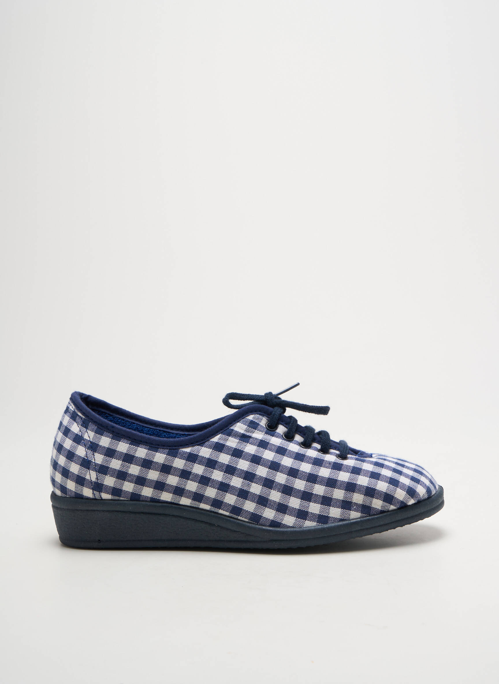 Profitez d’un vrai bon plan avec ces chaussons pour femme de la marque LA VAGUE, parfaits pour allier confort et petit prix. Leur motif vichy bleu et blanc apporte une touche rétro et pleine de charme, tandis que la semelle légèrement compensée offre un excellent maintien tout au long de la journée. Grâce à leur fermeture par lacets, ces pantoufles s’ajustent facilement à votre pied pour un maximum de confort à la maison, sans compromis sur l’économie.
