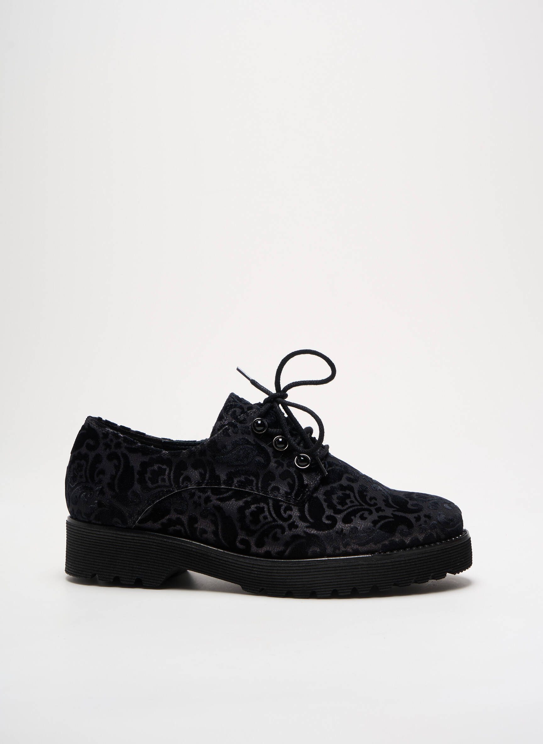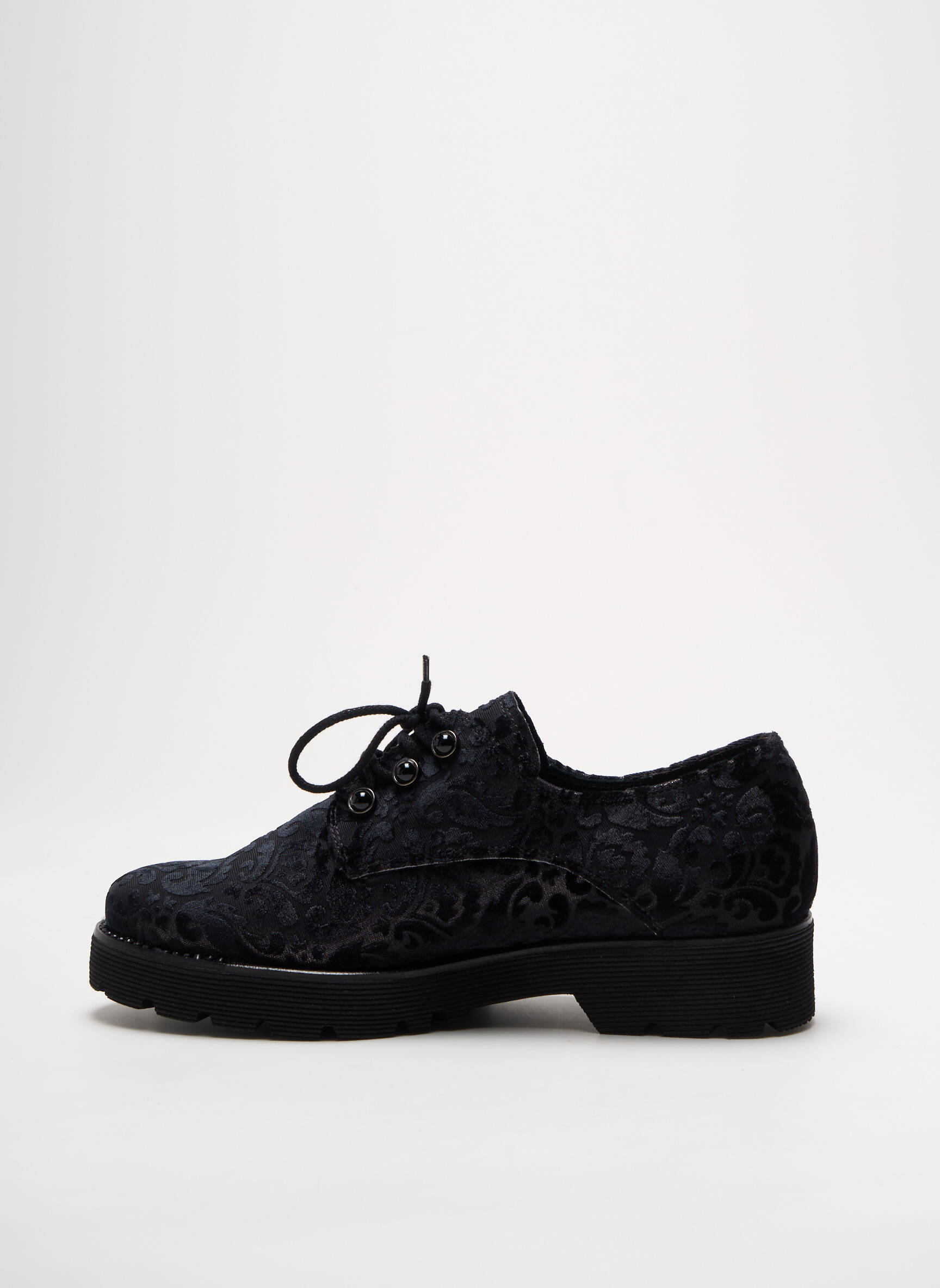 Osez le charme discrètement audacieux avec ce derby GABOR pour femme, où un velours noir délicatement embossé de motifs floraux ajoute une touche sophistiquée à une silhouette classique, soutenue par une semelle noire épaisse offrant stabilité et confort tout au long de la journée.