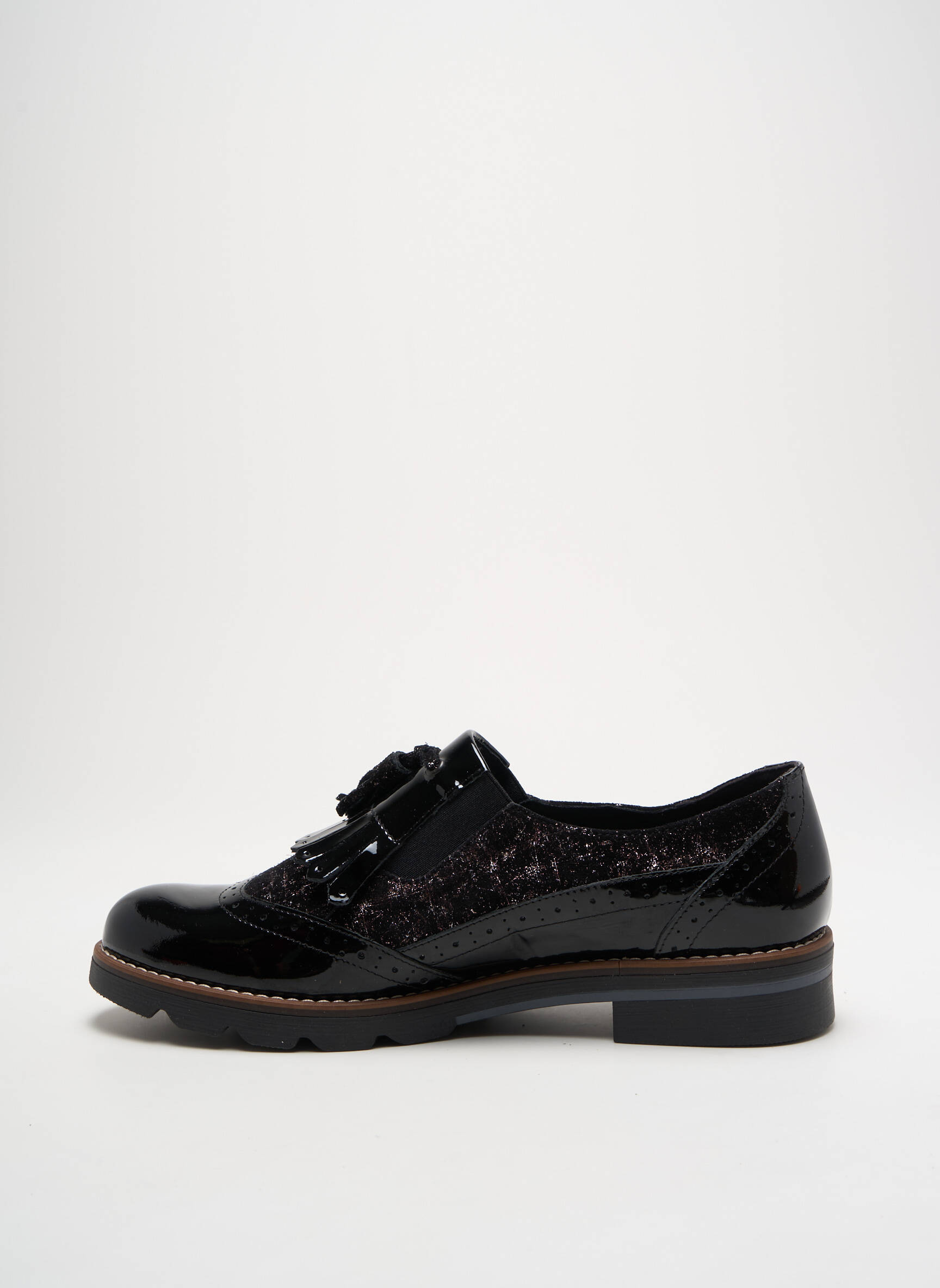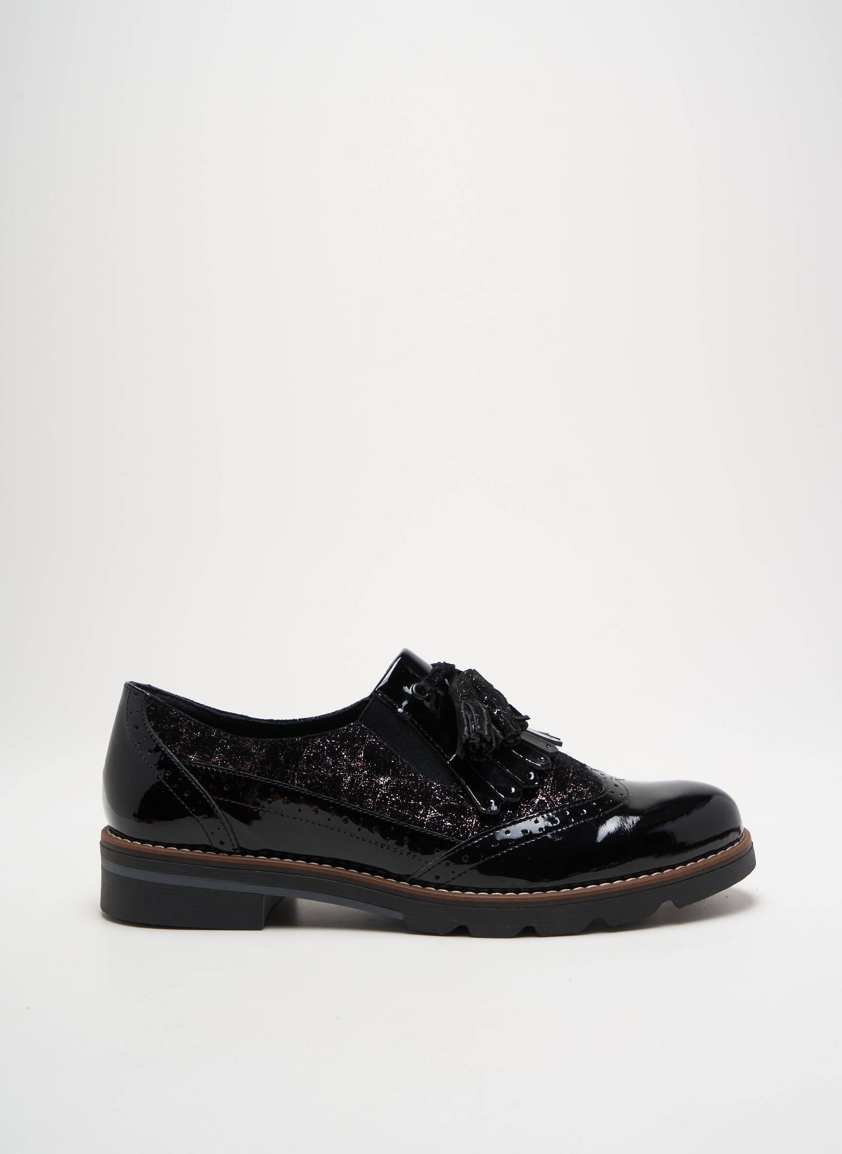 Saisissez l’opportunité d’acquérir ces derbies GEO-REINO pour femme à prix mini, une véritable bonne affaire pour compléter votre collection de chaussures avec élégance. Avec leur finition vernie brillante associée à des empiècements texturés et des détails frangés raffinés sur le dessus, elles affichent un style moderne et sophistiqué tout en restant faciles à porter au quotidien. Leur semelle contrastée et leur allure intemporelle en font un indispensable à ne pas manquer pour accessoiriser vos tenues sans vous ruiner.