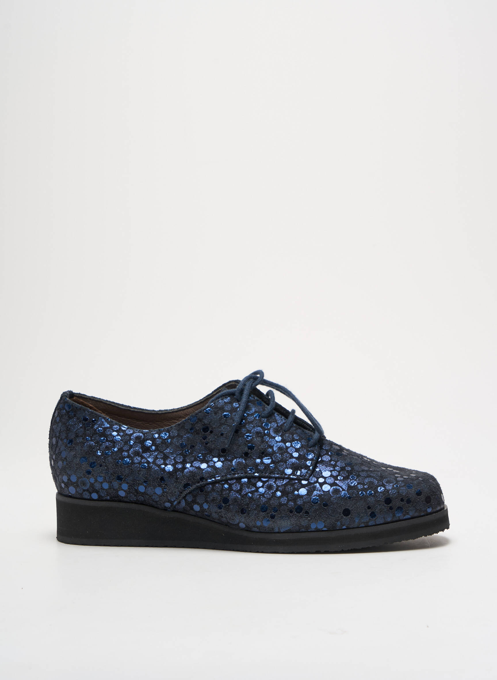 Osez marcher avec l’élégance d’un ciel étoilé à vos pieds grâce à ces derbies JMG HOUCKE pour femme, qui captivent par leur cuir vernis bleu profond parsemé de motifs circulaires texturés scintillants, accentués par une forme classique revisitée et une semelle noire douce offrant à la fois confort et style contemporain.