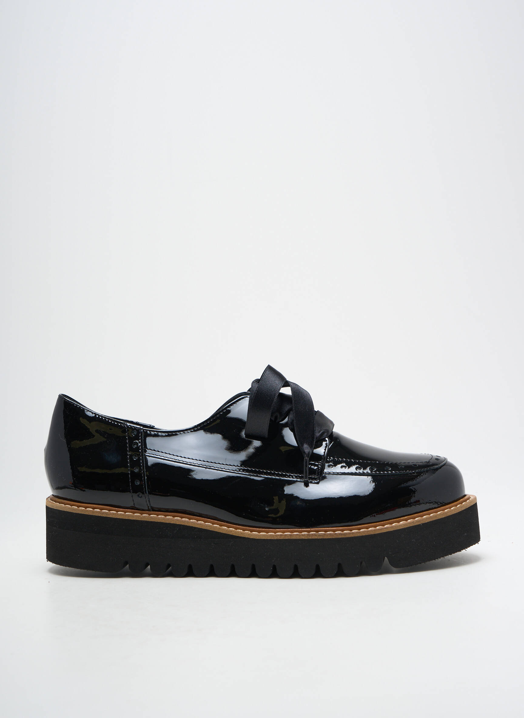 Craquez pour ces derbies MYMA pour femme, une véritable opportunité à saisir pour donner du style à vos tenues sans vous ruiner. Le vernis noir brillant apporte une touche très moderne et sophistiquée, tandis que les lacets en ruban satiné ajoutent une note féminine et originale. La semelle épaisse avec ses détails contrastés garantit un confort optimal au quotidien et affirme votre silhouette. C’est le bon plan du moment pour allier élégance et économies, à prix destockage.