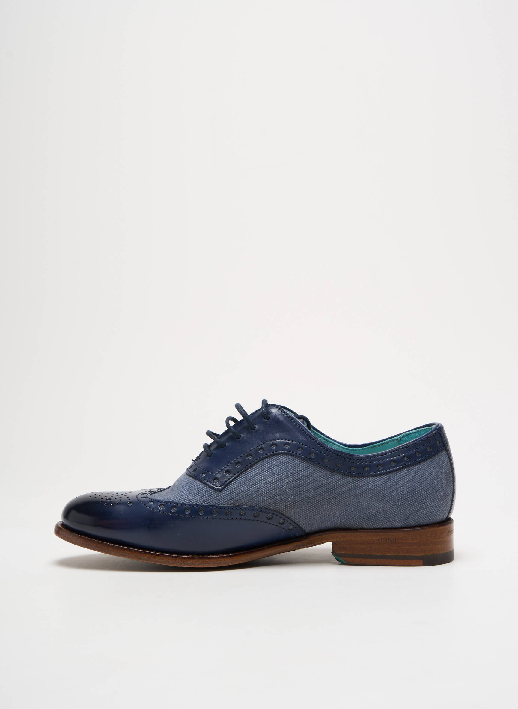 Quand élégance rime avec audace, ce derby PARADIGMA pour femme se révèle un véritable chef-d'œuvre de style. Sa silhouette classique est modernisée par un mariage subtil entre un cuir bleu marine lustré aux détails perforés sophistiqués et une toile bleu denim qui apporte une touche décontractée chic. La fine semelle en cuir contraste joliment avec la tige, soulignant une allure à la fois raffinée et contemporaine, idéale pour celles qui veulent allier confort et personnalité dans leur look quotidien.