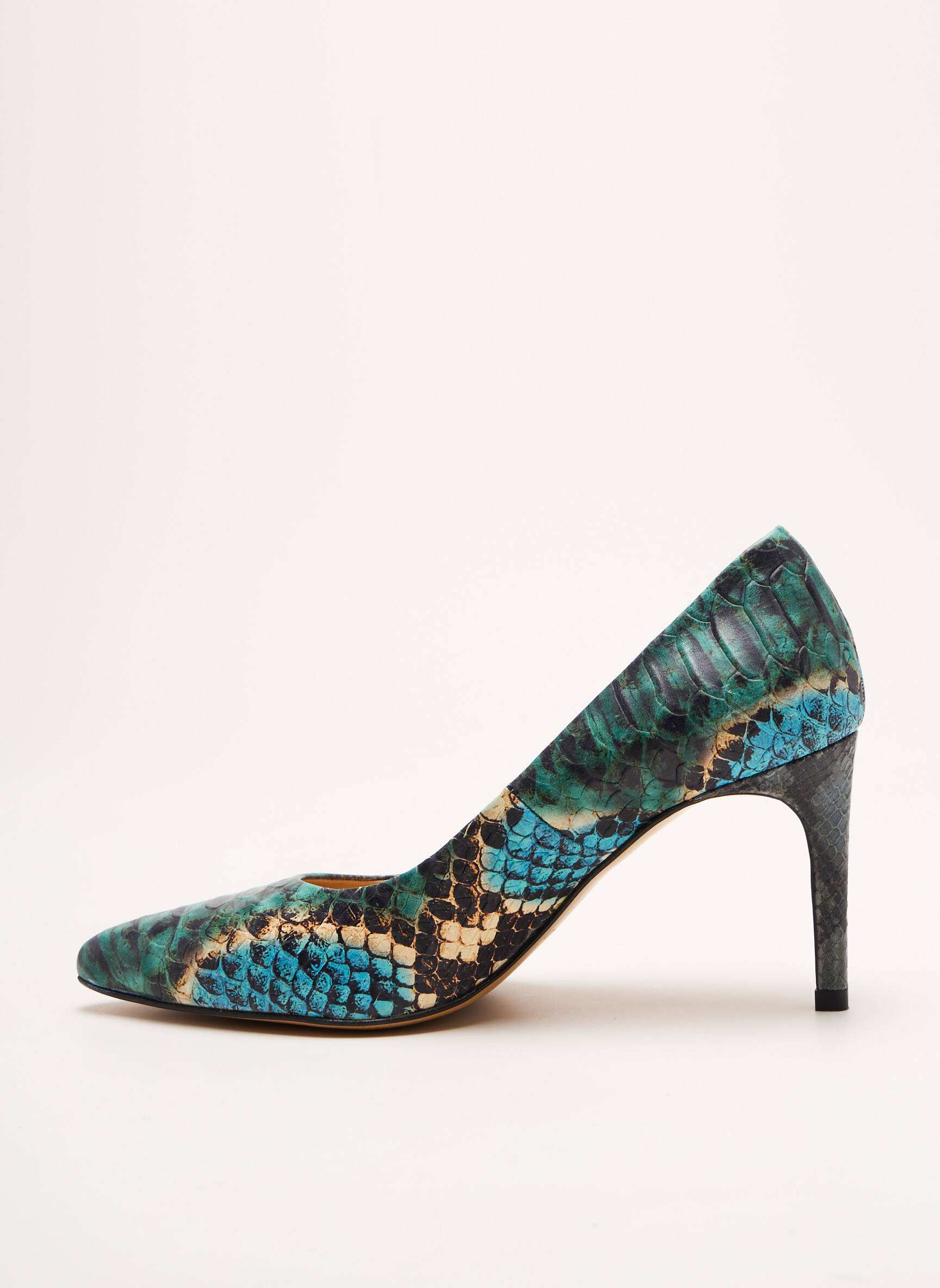 Osez l’exotisme subtilement réinterprété avec ces escarpins qui semblent tout droit sortis d’une chasse au trésor tropical. Signés CRÉATIS, ils dévoilent un effet peau de serpent dans des tons bleus et verts vibrants, fusionnant élégance et originalité avec leur talon fin qui allonge la silhouette avec grâce. Leur courbe parfaitement dessinée épouse le pied pour un maintien idéal, tandis que leur finition brillante captive le regard à chaque pas.