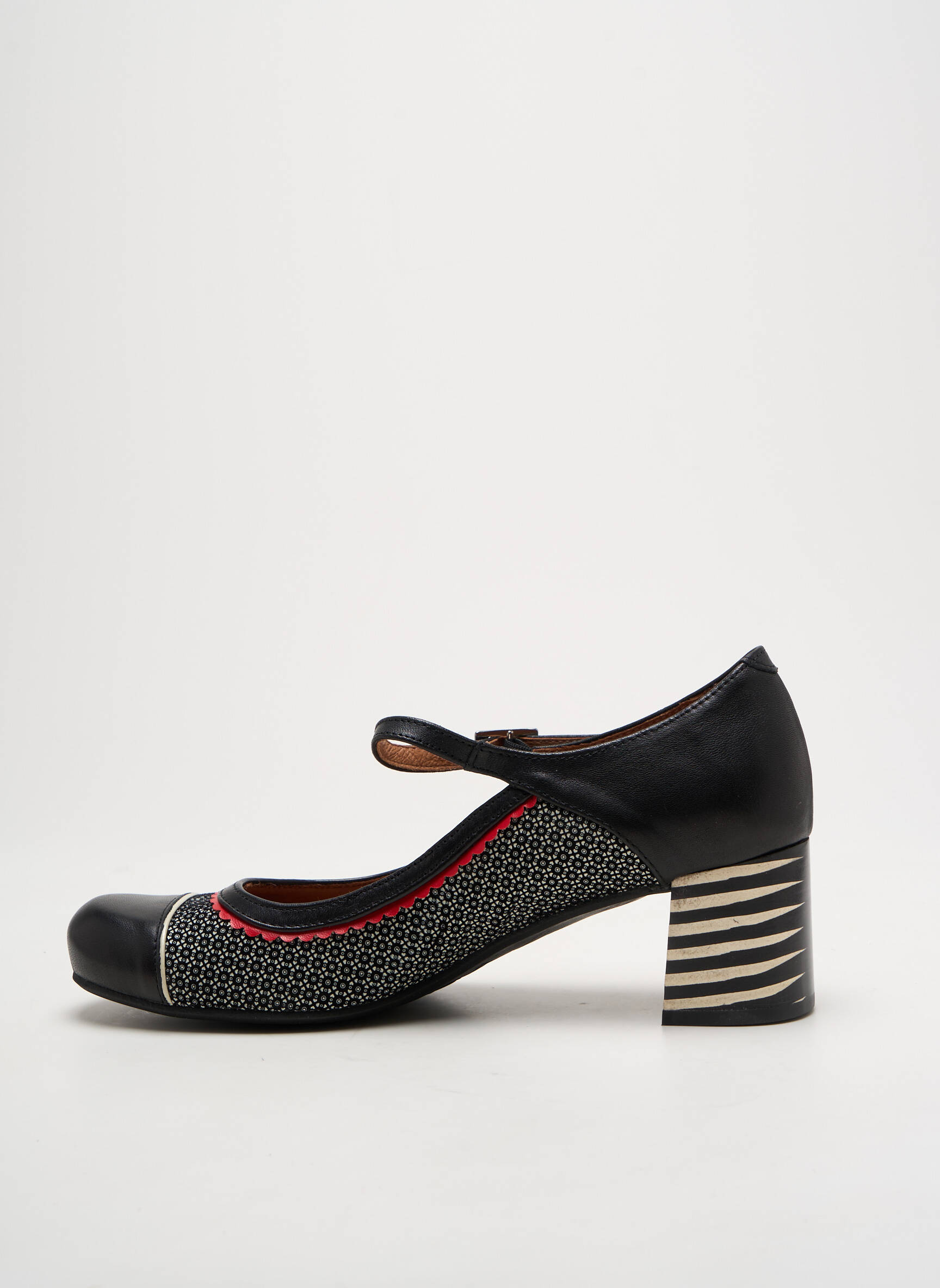 Profitez d’un vrai bon plan mode avec ces escarpins Nemonic pour femme, proposés à prix doux pour allier économie et style. Leur look rétro revisité séduit par une bride élégante, un talon large à motif rayé et un jeu de textures graphiques noir et blanc rehaussé d’une touche rouge subtil, parfait pour personnaliser vos tenues tout en restant confortable toute la journée.
