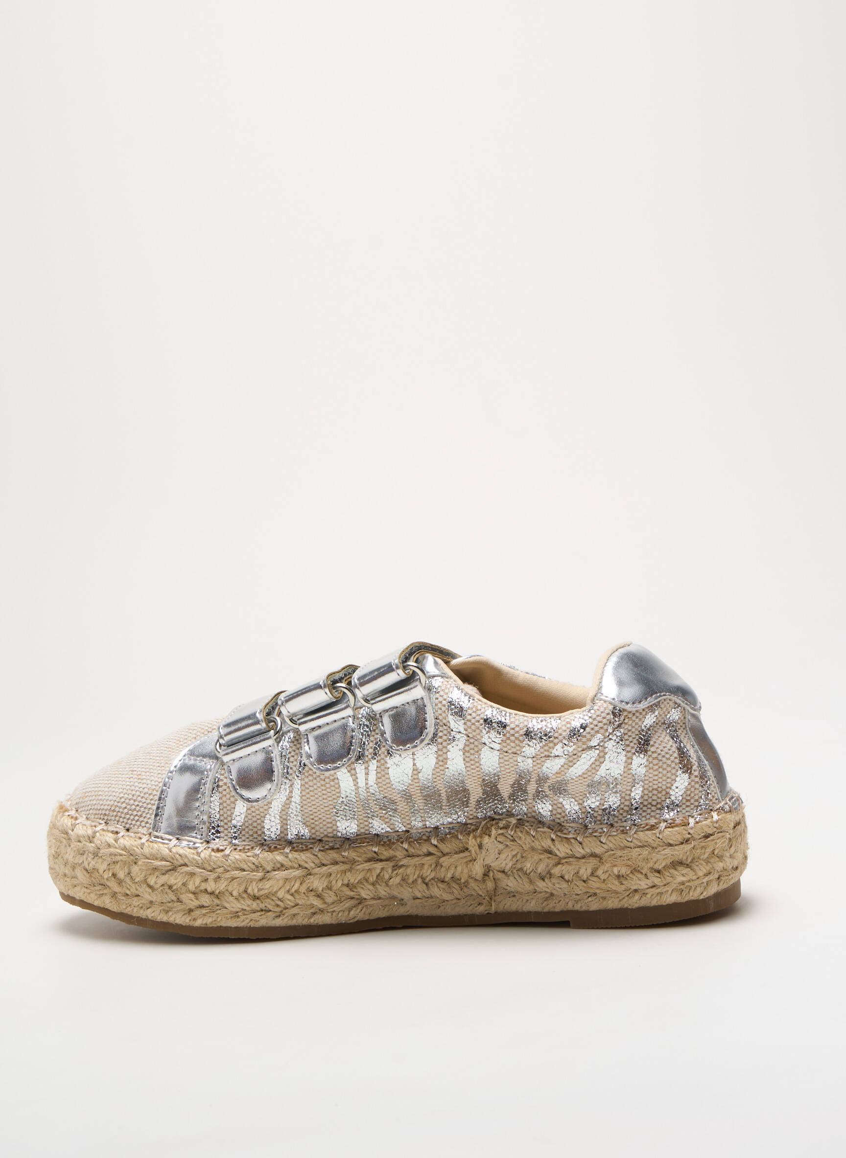Profitez d’un bon plan irrésistible avec ces espadrilles pour femme signées FINDLAY, parfaites pour adopter un style tendance sans vous ruiner. Leur design unique associe une base en toile naturelle rehaussée de touches argentées et de motifs zébrés, pour un look à la fois original et facile à porter au quotidien, tandis que les brides scratch brillantes offrent un ajustement pratique et moderne. L’épaisse semelle corde rappelle l’esprit authentique de l’espadrille tout en assurant un confort optimal pour toutes vos sorties estivales, et ce à prix doux.