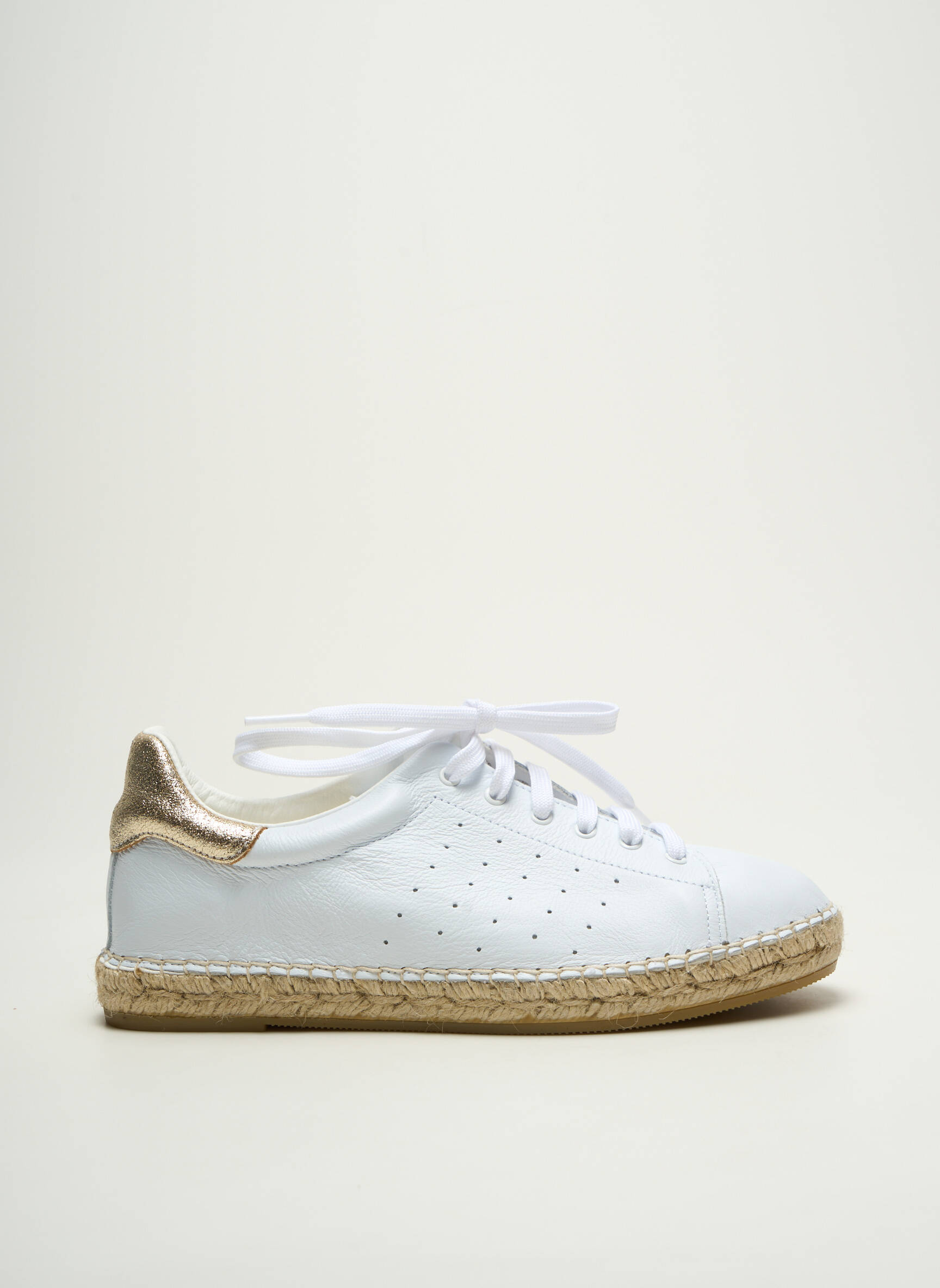 Profitez d’une véritable affaire avec ces espadrilles signées LA MAISON DE L'ESPADRILLE pour femme, qui allient l’élégance d’un cuir blanc intemporel à la décontraction d’une semelle en corde typique, relevées par une touche métallique dorée au talon pour une note tendance. Ce modèle pas cher offre un excellent compromis entre style moderne et confort, parfait pour compléter vos tenues estivales tout en réalisant des économies sur une pièce de qualité issue du déstockage.