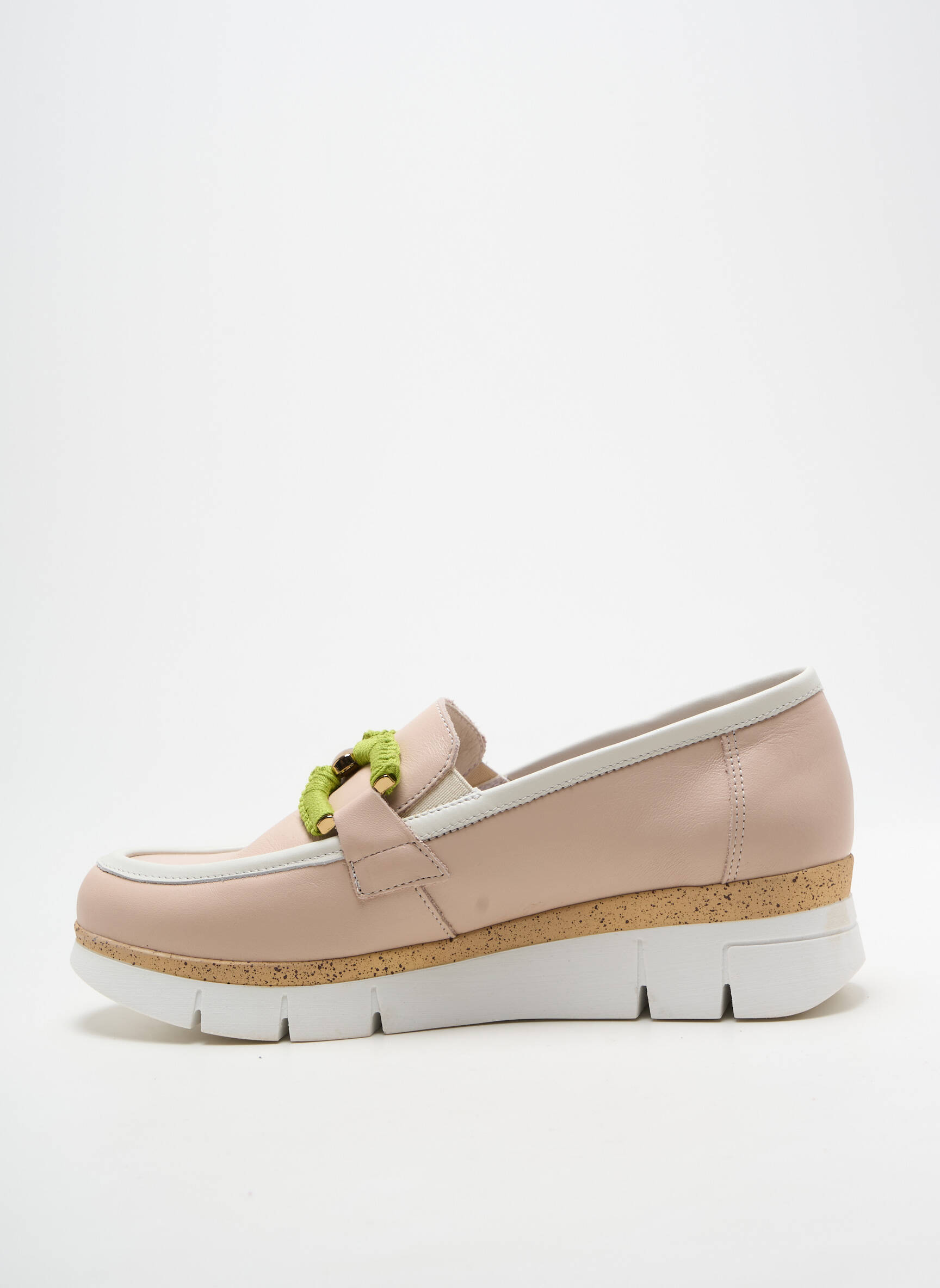 Profitez d’un super bon plan avec ce mocassin DORKING pour femme, proposé à prix tout doux pour donner à votre garde-robe une touche chic et moderne sans vous ruiner. Son coloris rose poudré apporte de la douceur à vos tenues, tandis que le détail de la chaîne vert anis vient dynamiser l’ensemble avec originalité. Sa semelle épaisse blanche, soulignée par une touche de liège, promet un confort optimal et un style résolument tendance au quotidien.