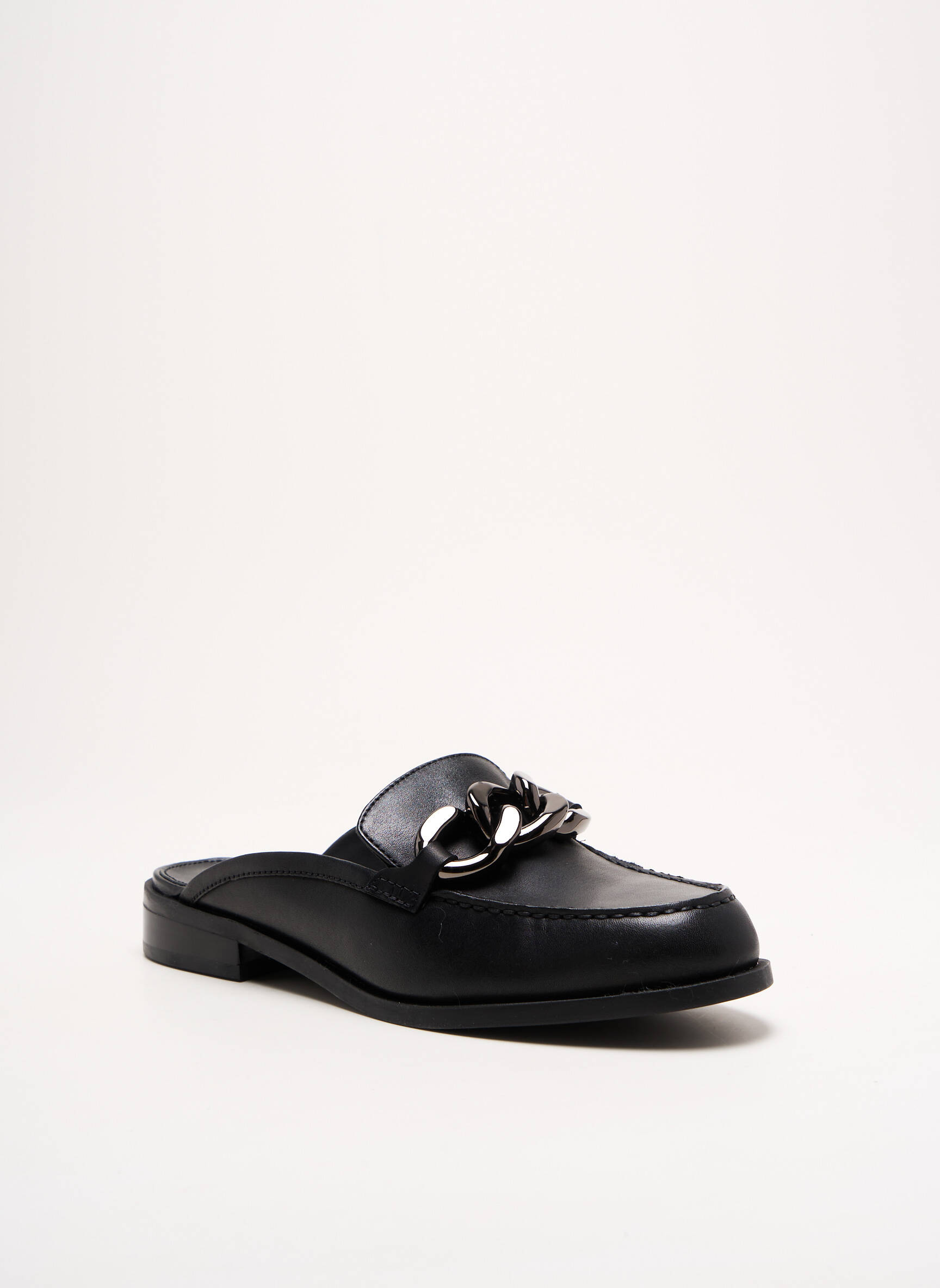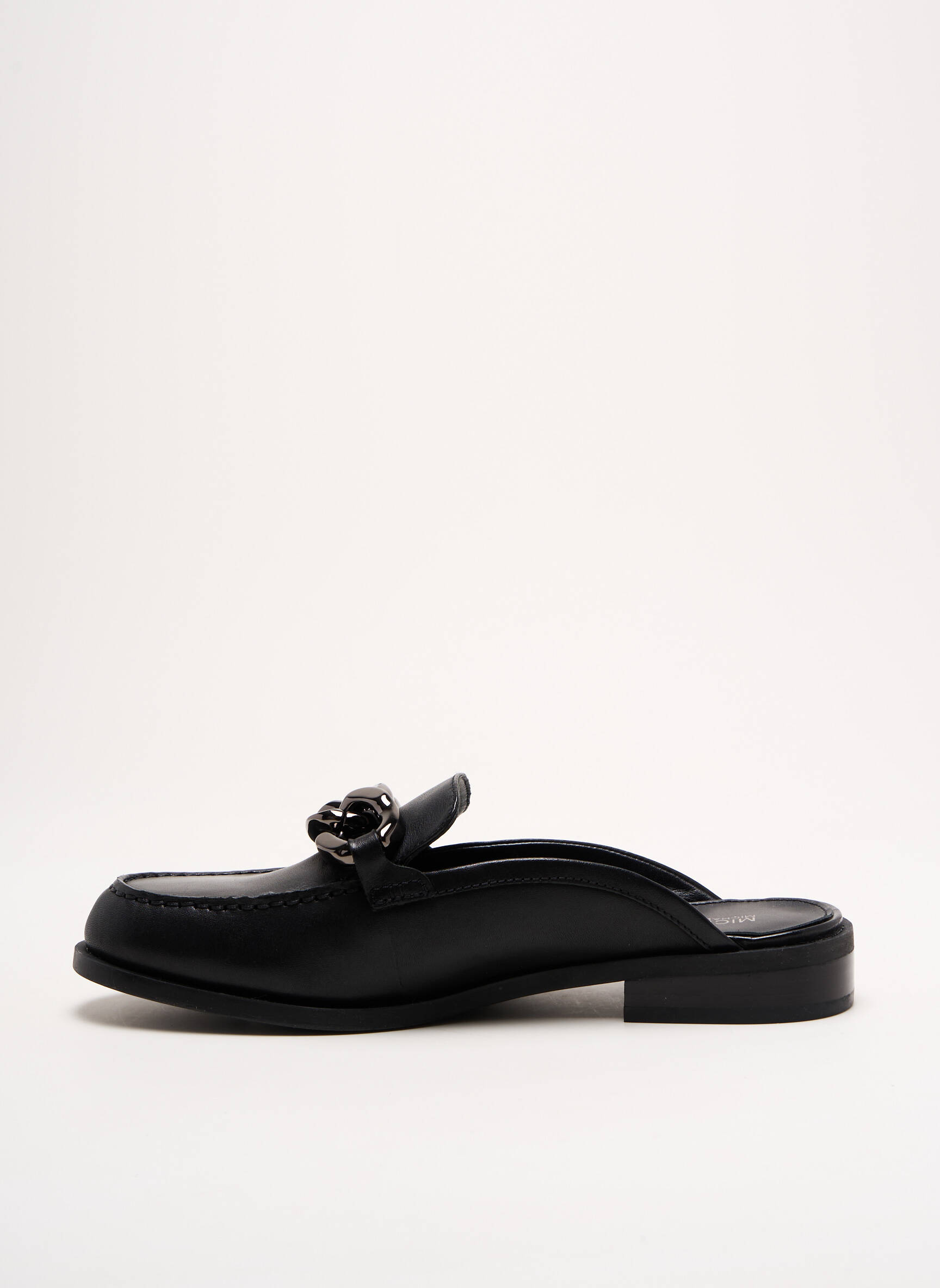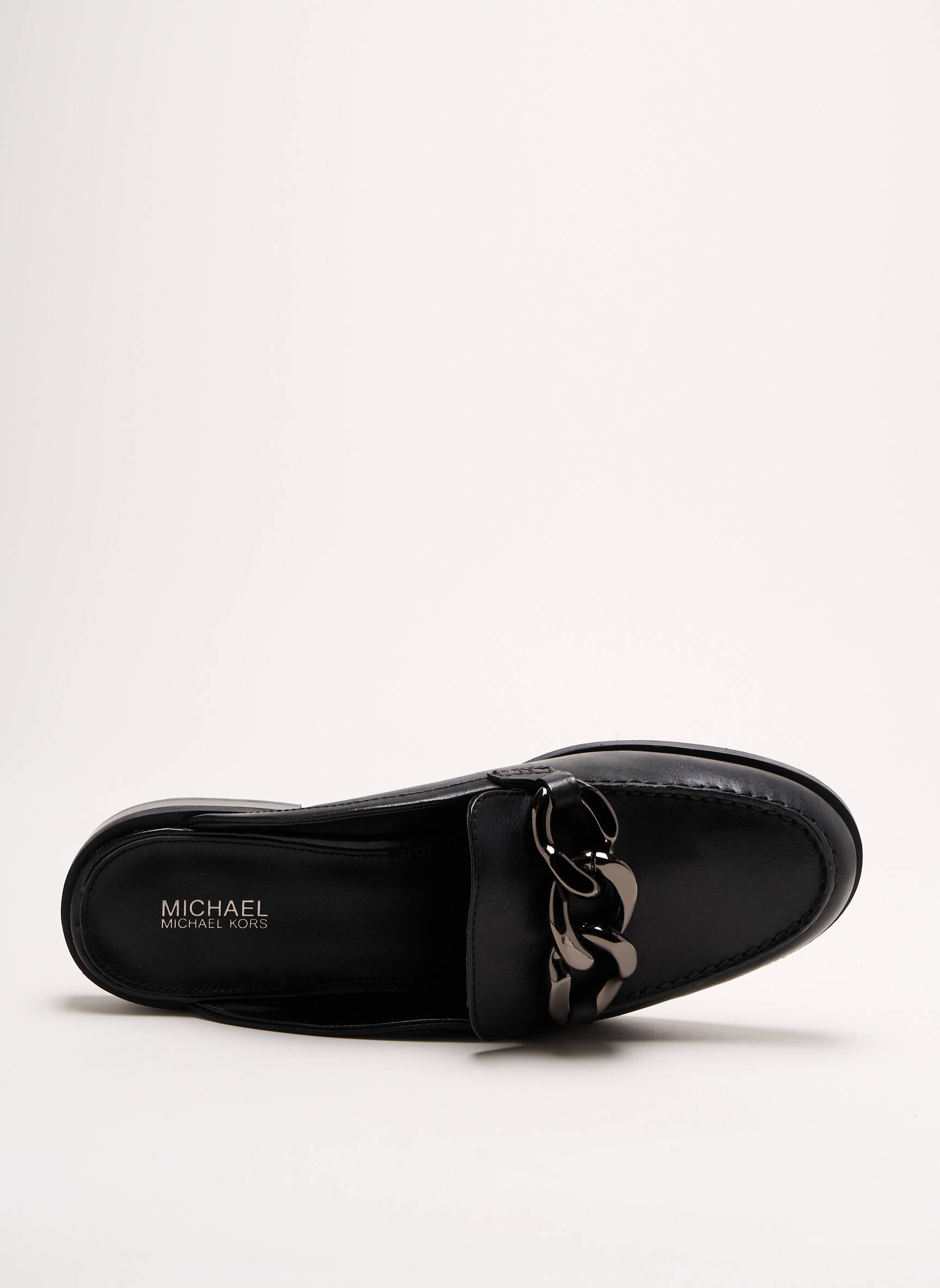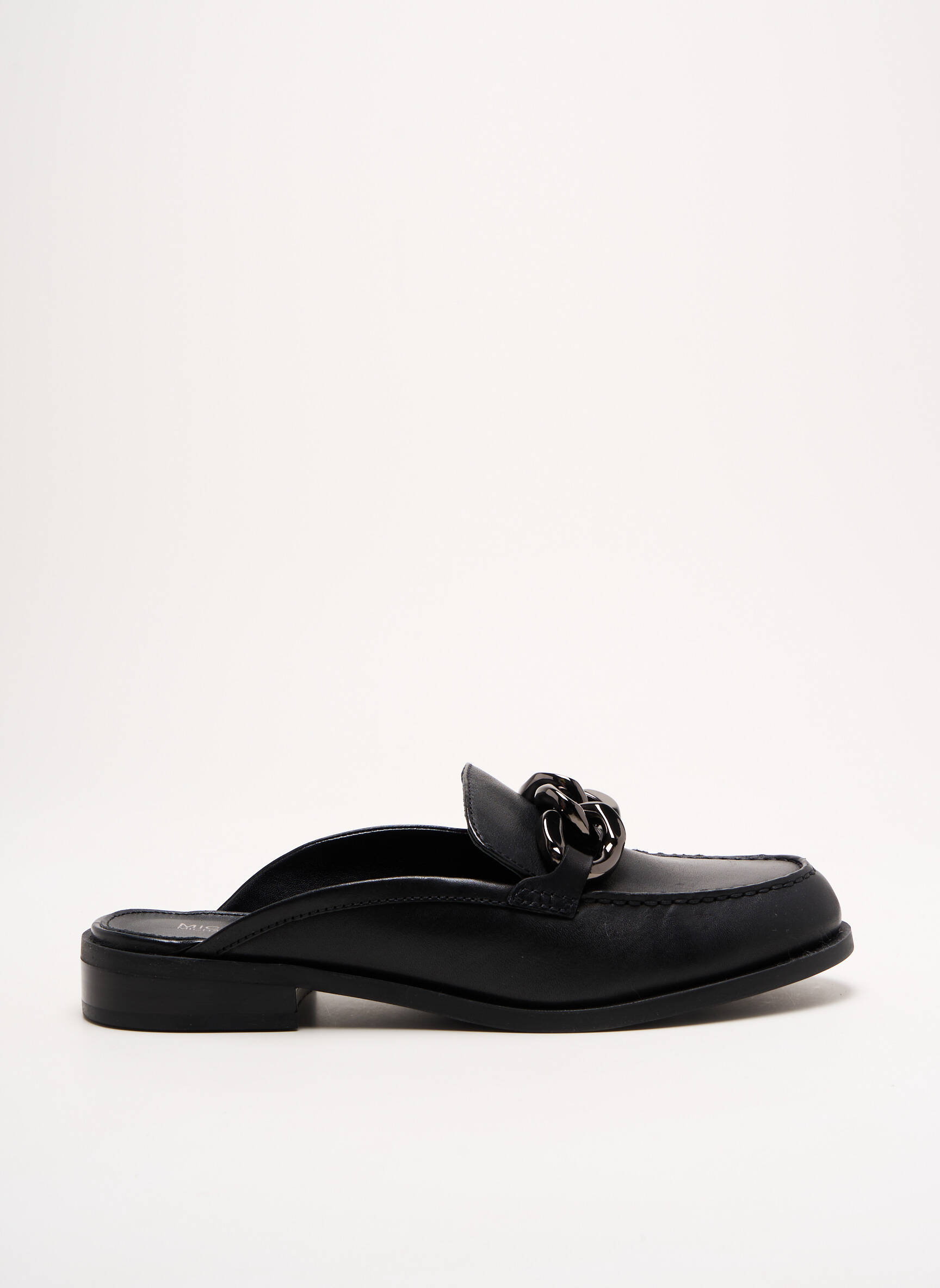 Imaginez un mocassin qui se déchausse avec une élégance absolue, alliant la simplicité à un raffinement subtil. Ce modèle signé MICHAEL KORS présente une silhouette épurée en cuir noir lisse, rehaussée par une délicate chaîne métallique en guise de décor sur le dessus, apportant une touche moderne et chic. Son talon plat offre un confort idéal tandis que la forme mule ouverte à l’arrière facilite une mise enfilée fluide, parfaite pour une allure décontractée mais soignée.