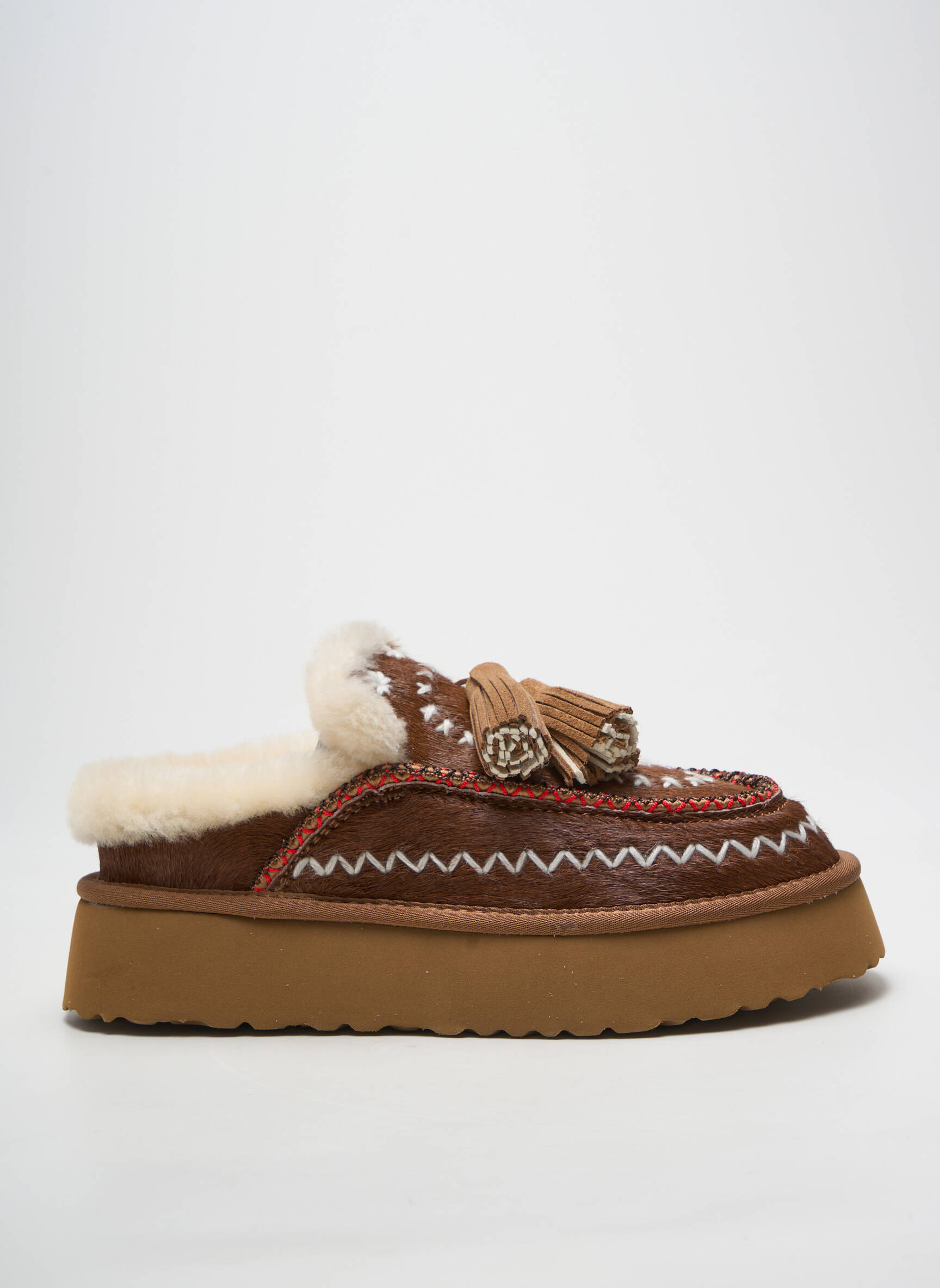 Craquez pour ces mules sabots NAN-KU pour femme, une vraie trouvaille à prix mini sur notre site de déstockage. Idéales pour allier confort et style sans se ruiner, elles affichent une belle finition en suédine marron réchauffée par un intérieur doux façon fourrure, des surpiqûres contrastées et des détails tressés colorés, complétés par deux pampilles élégantes qui apportent une touche bohème dans l’air du temps. Vous profitez ici d’un look tendance avec un confort incomparable tout en faisant de vraies économies.