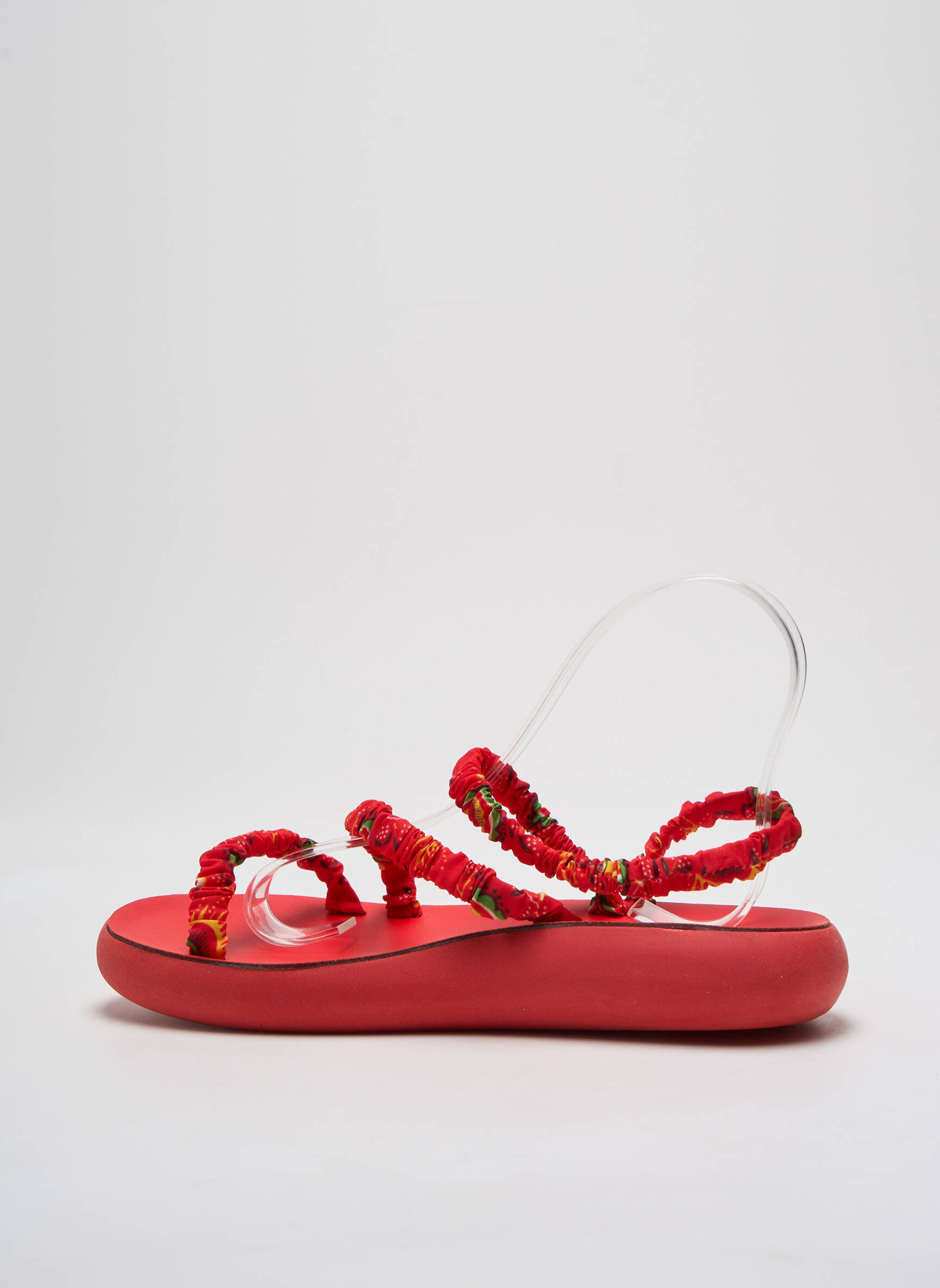 Quand l’audace rencontre le confort, ces sandales de la marque ANCIENT GREEK SANDALS pour femme révèlent un design unique où les lanières rouges texturées en tissu froissé s’entrelacent avec légèreté sur une semelle épaisse et moelleuse, offrant un équilibre parfait entre modernité et style décontracté.
