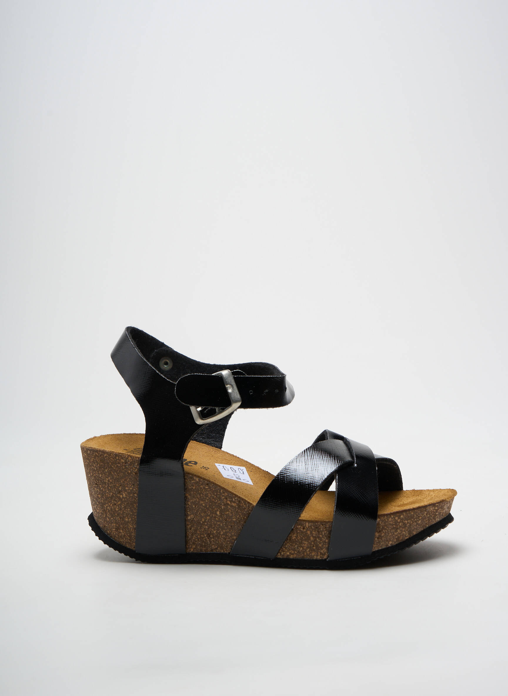 Profitez d'un bon plan avec ces sandales de la marque BIO TIME, parfaites pour allier style et confort sans vous ruiner. Ce modèle à brides croisées offre un joli contraste entre le noir brillant et la semelle effet liège, tout en étant doté d'une semelle compensée qui élance la silhouette. Le maintien de la cheville est assuré par une bride à boucle, idéale pour des journées ensoleillées au look chic et décontracté sans faire de compromis sur le prix.