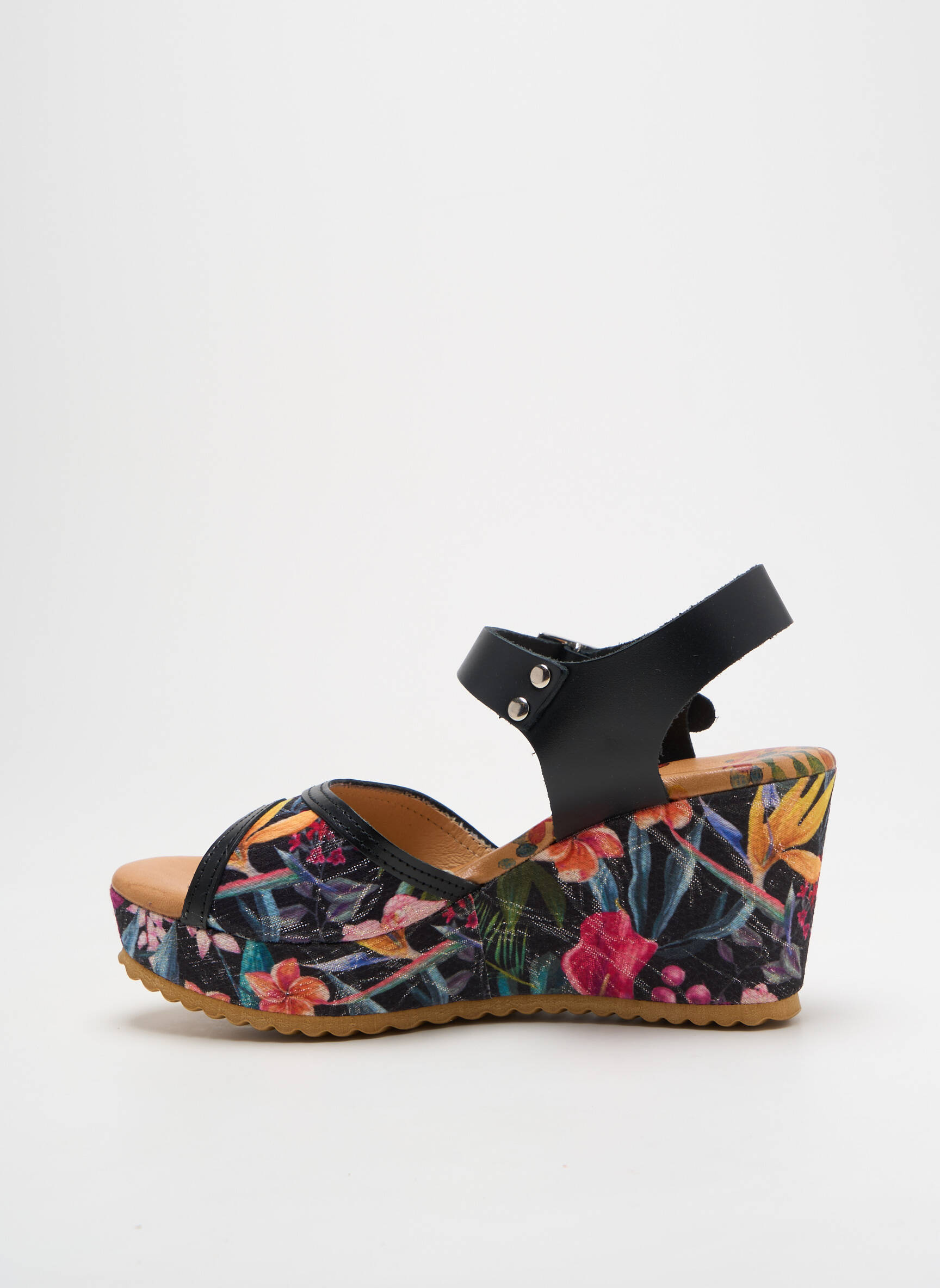 Craquez pour ces sandales KADANCIA pour femme, une véritable bonne affaire pour apporter une touche de fantaisie à vos tenues estivales sans vous ruiner. Ce modèle à semelle compensée séduit par son imprimé floral coloré, idéal pour illuminer vos journées, et ses brides noires élégantes qui assurent un maintien confortable. Profitez à petit prix d’une pièce tendance qui allie style et praticité pour toutes vos sorties d'été.