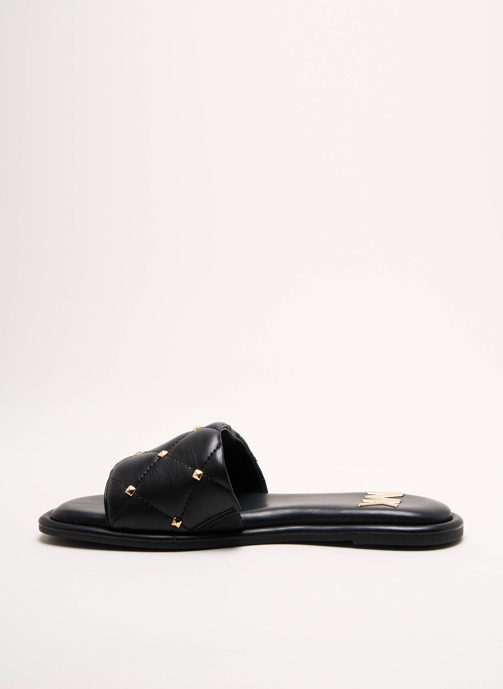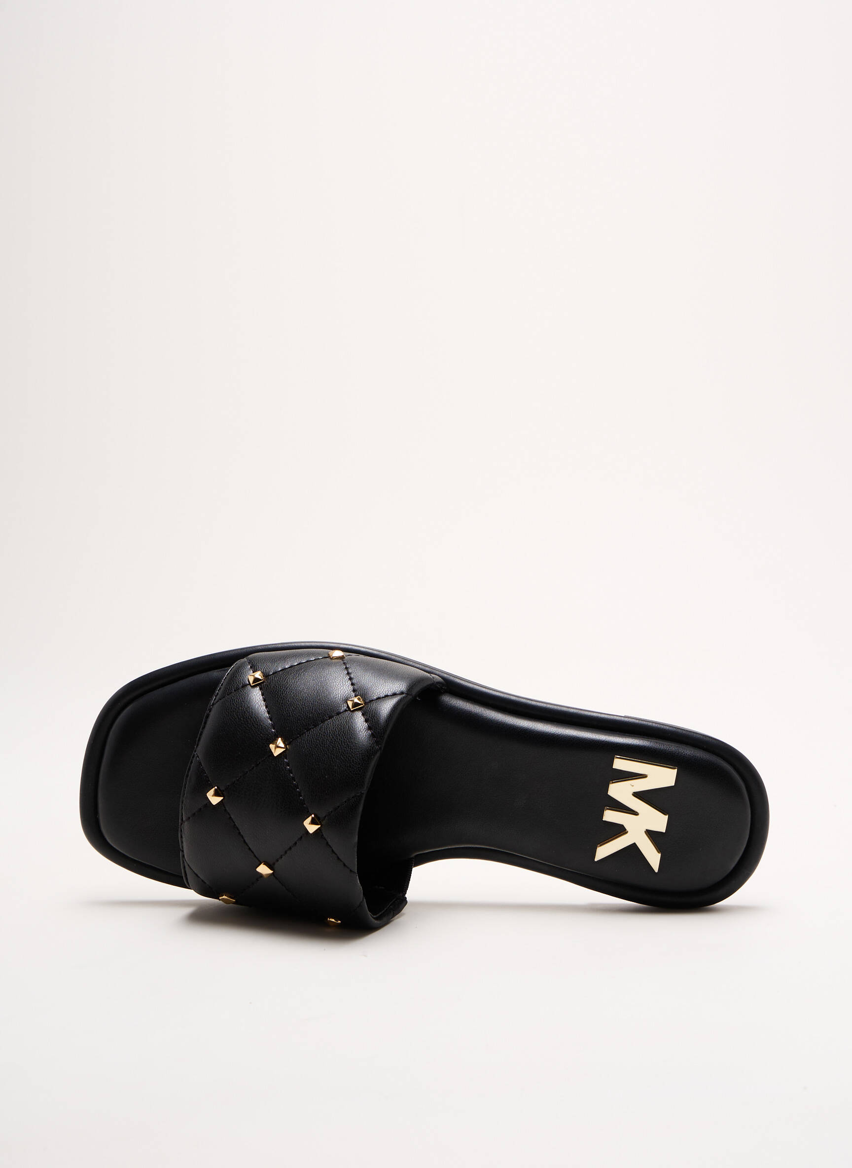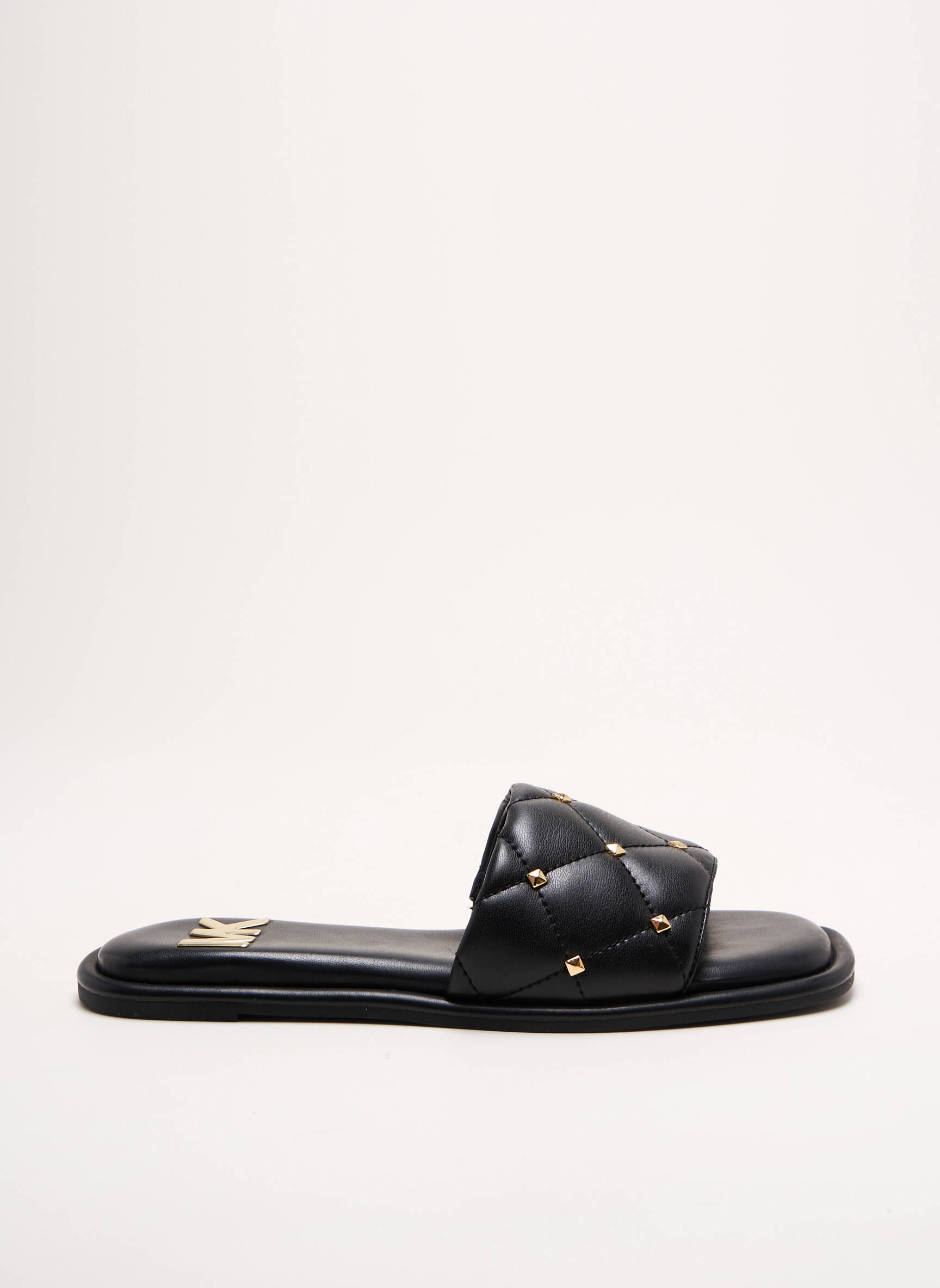 Osez l'élégance minimaliste qui murmure luxe à chaque pas avec ces sandales MICHAEL KORS pour femme, où une large bande matelassée en cuir noir, délicatement ornée de petits clous dorés, vient envelopper le pied avec douceur et style, tandis que la semelle plate offre une silhouette épurée et confortable idéale pour sublimer toutes vos tenues estivales.