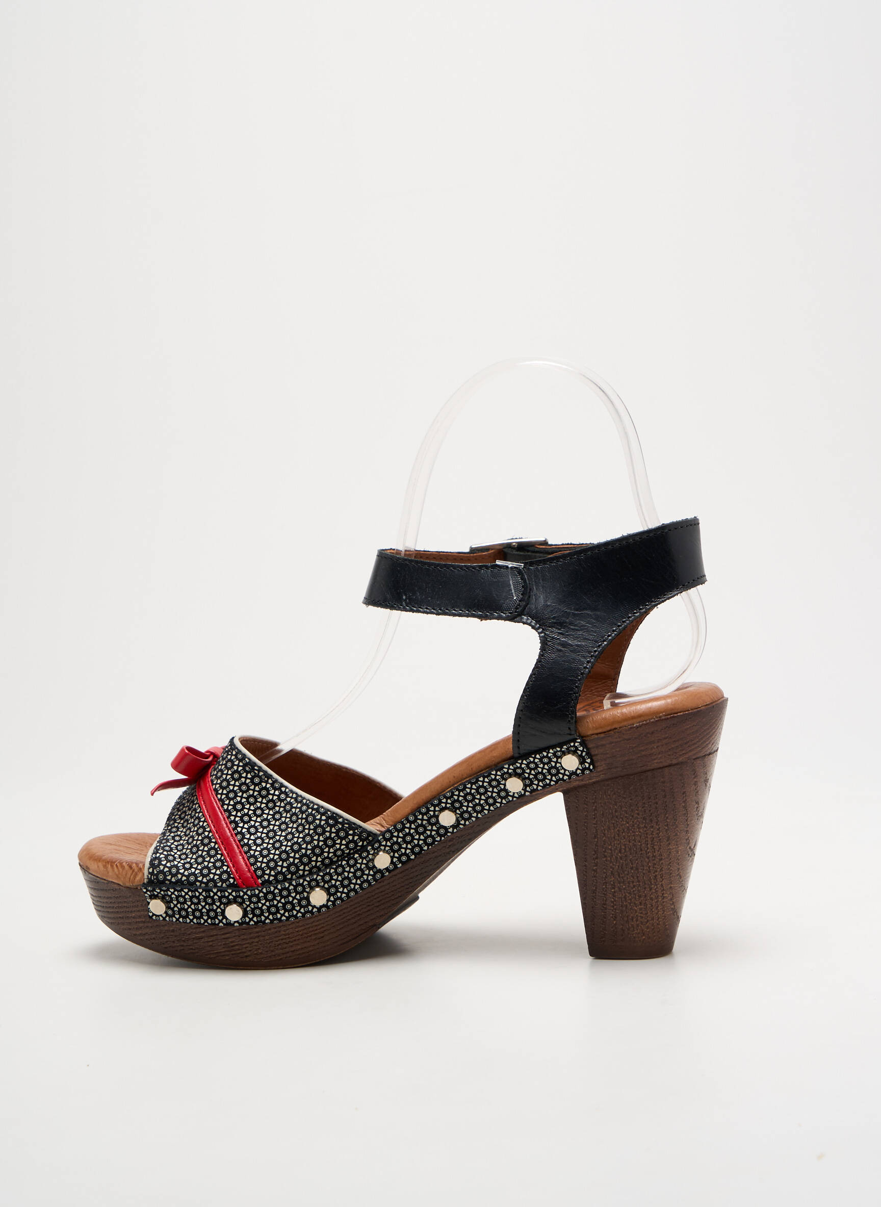 Craquez pour ces sandales NEMONIC à prix mini, un vrai bon plan pour apporter du style à vos looks estivaux sans vous ruiner. Ce modèle propose une jolie combinaison de motifs géométriques noirs et blancs rehaussés d’un nœud rouge vif, avec une bride noire à la cheville pour un maintien parfait et des finitions cloutées ultra-tendance, le tout sur un talon épais en bois qui offre confort et élégance toute la journée. C’est l’offre idéale pour profiter d’une chaussure unique et tendance, tout en maîtrisant votre budget.