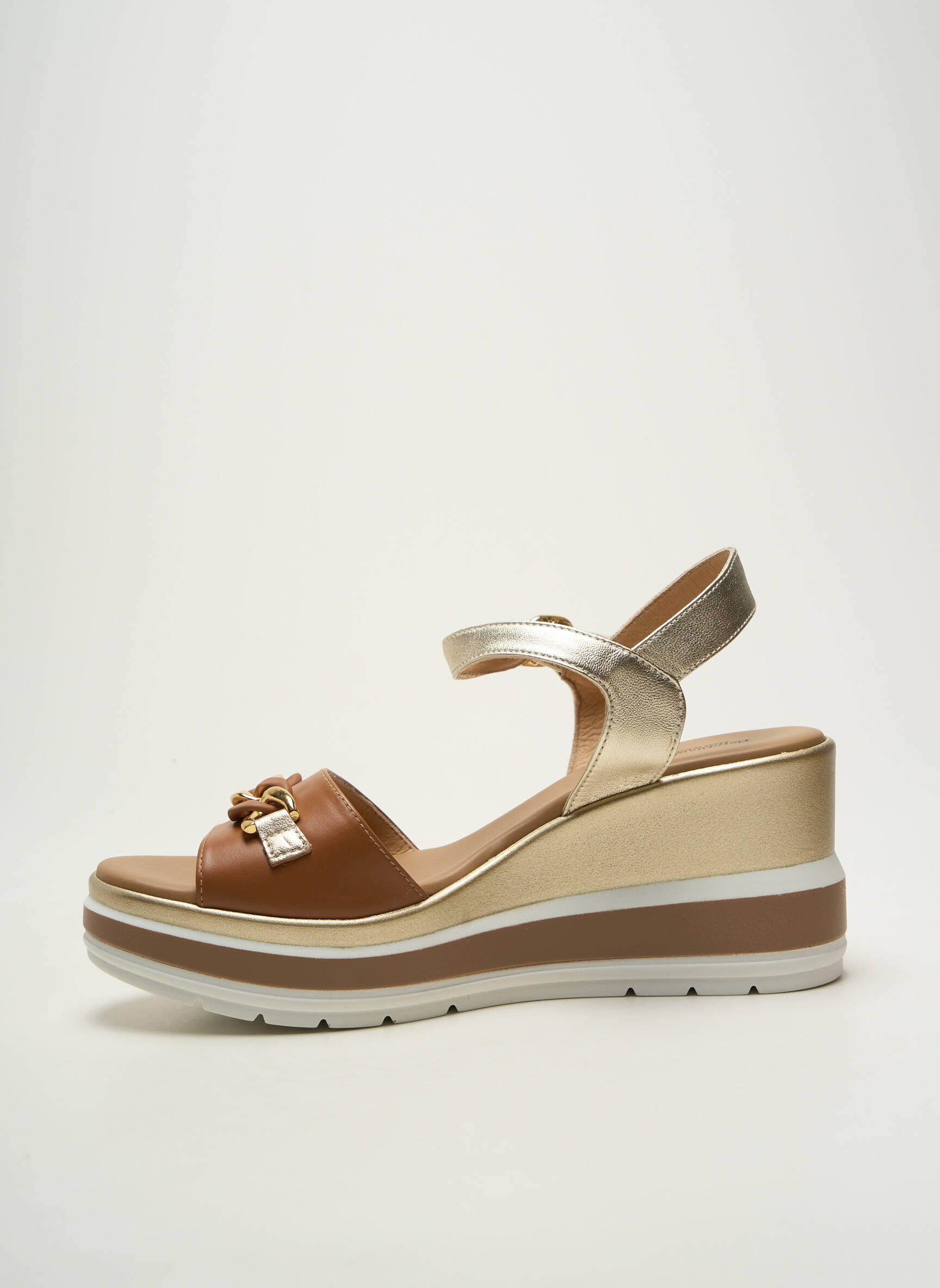 Profitez d’un vrai bon plan avec ces sandales NERO GIARDINI pour femme qui allient style raffiné et confort avec leur talon compensé tendance. Leur alliance de tons dorés et camel, rehaussée par une bride ornée d’une chaîne élégante, leur donne un look chic parfait pour la belle saison, tout en restant accessibles pour renouveler votre dressing sans vous ruiner.