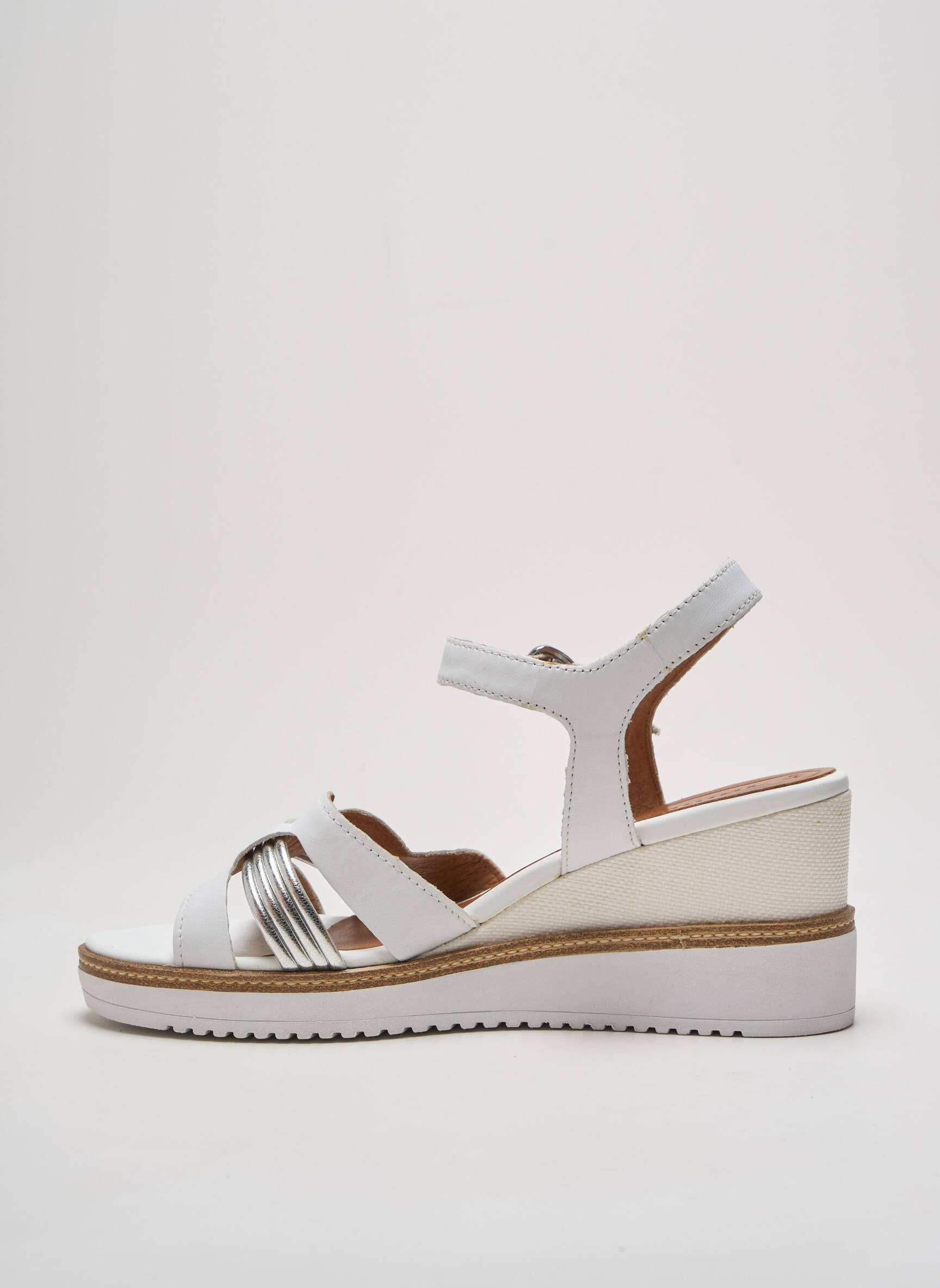 Imaginez une balade ensoleillée où chaque pas rime avec élégance et confort, c'est ce que promet cette sandale Tamaris. Cette pièce allie une semelle compensée en blanc cassé subtilement texturée à une tige en cuir blanc scintillant, ornée de fines brides croisées qui laissent respirer le pied tout en soulignant sa féminité. La boucle en forme de cœur argentée à la bride cheville apporte une touche délicate et raffinée, faisant de cette sandale un indispensable pour une allure à la fois chic et décontractée.