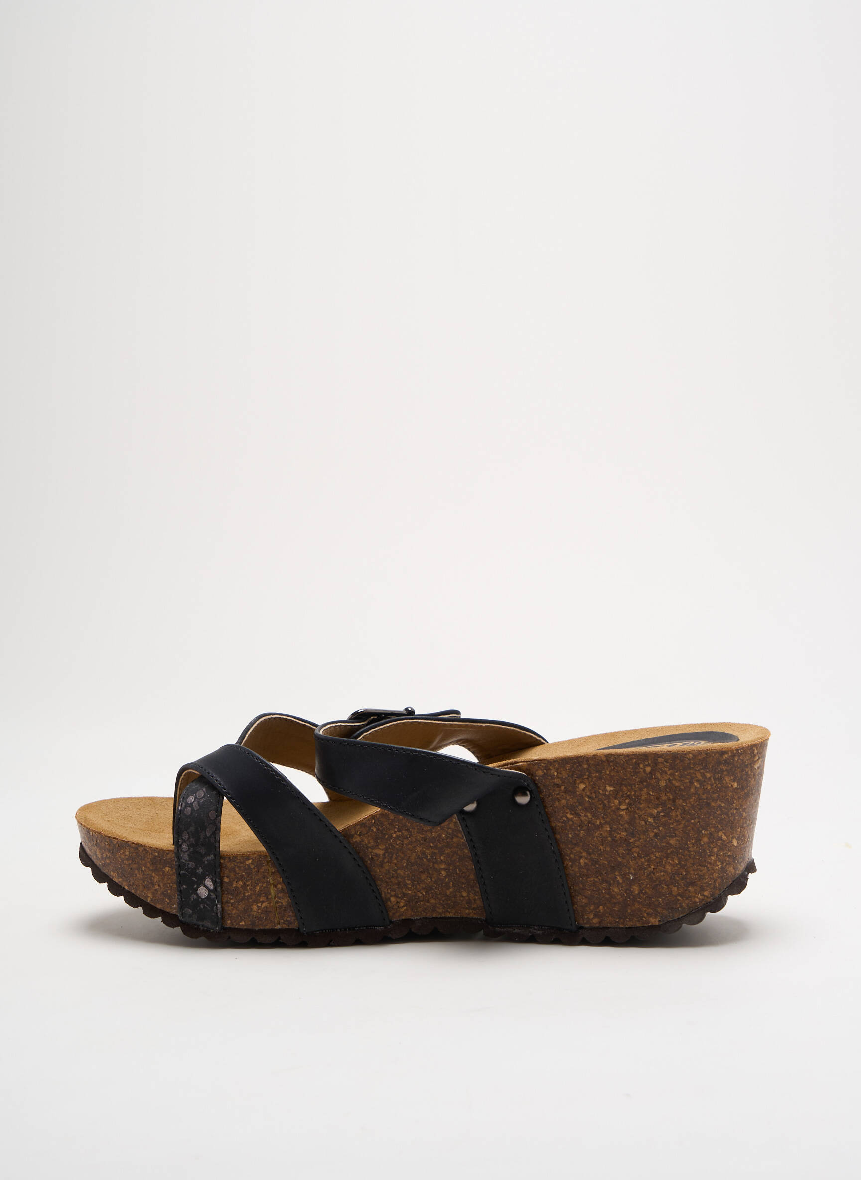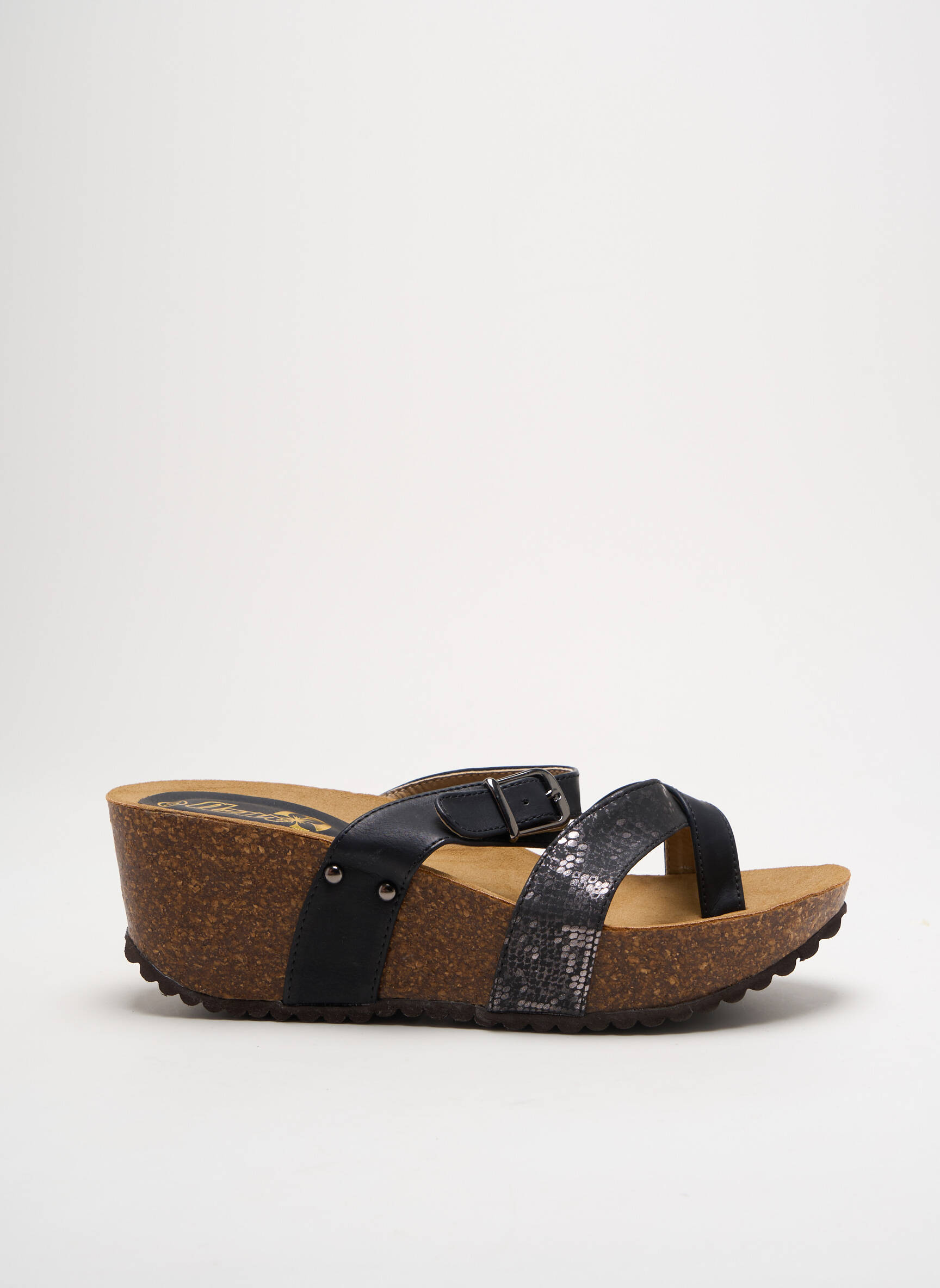 Offrez-vous un look tendance sans vous ruiner avec ces tongs AZUR pour femme qui allient élégance et confort grâce à leur semelle compensée en liège et leurs brides croisées façon cuir noir subtilement texturées, parfaites pour valoriser vos tenues estivales à petit prix.