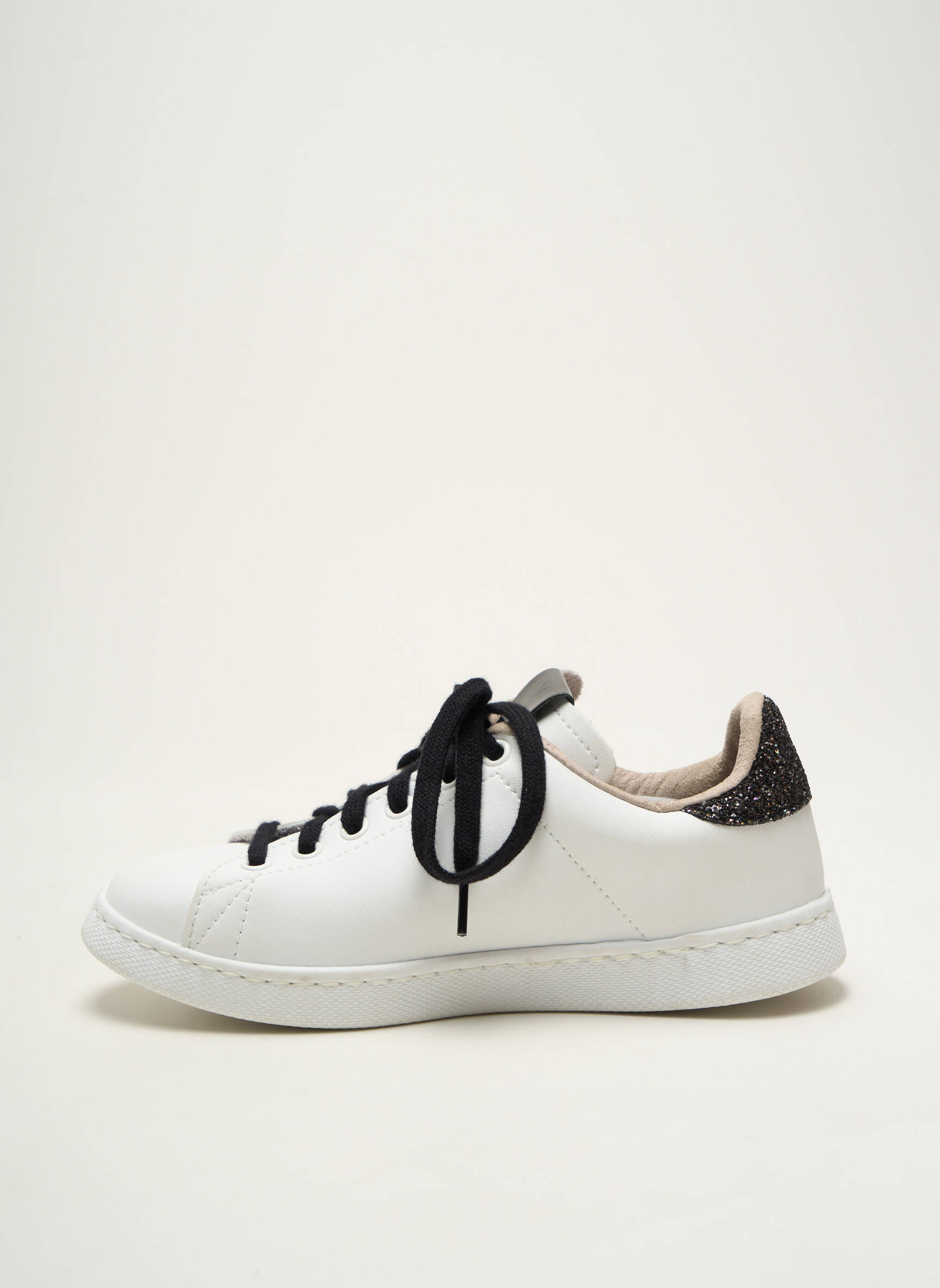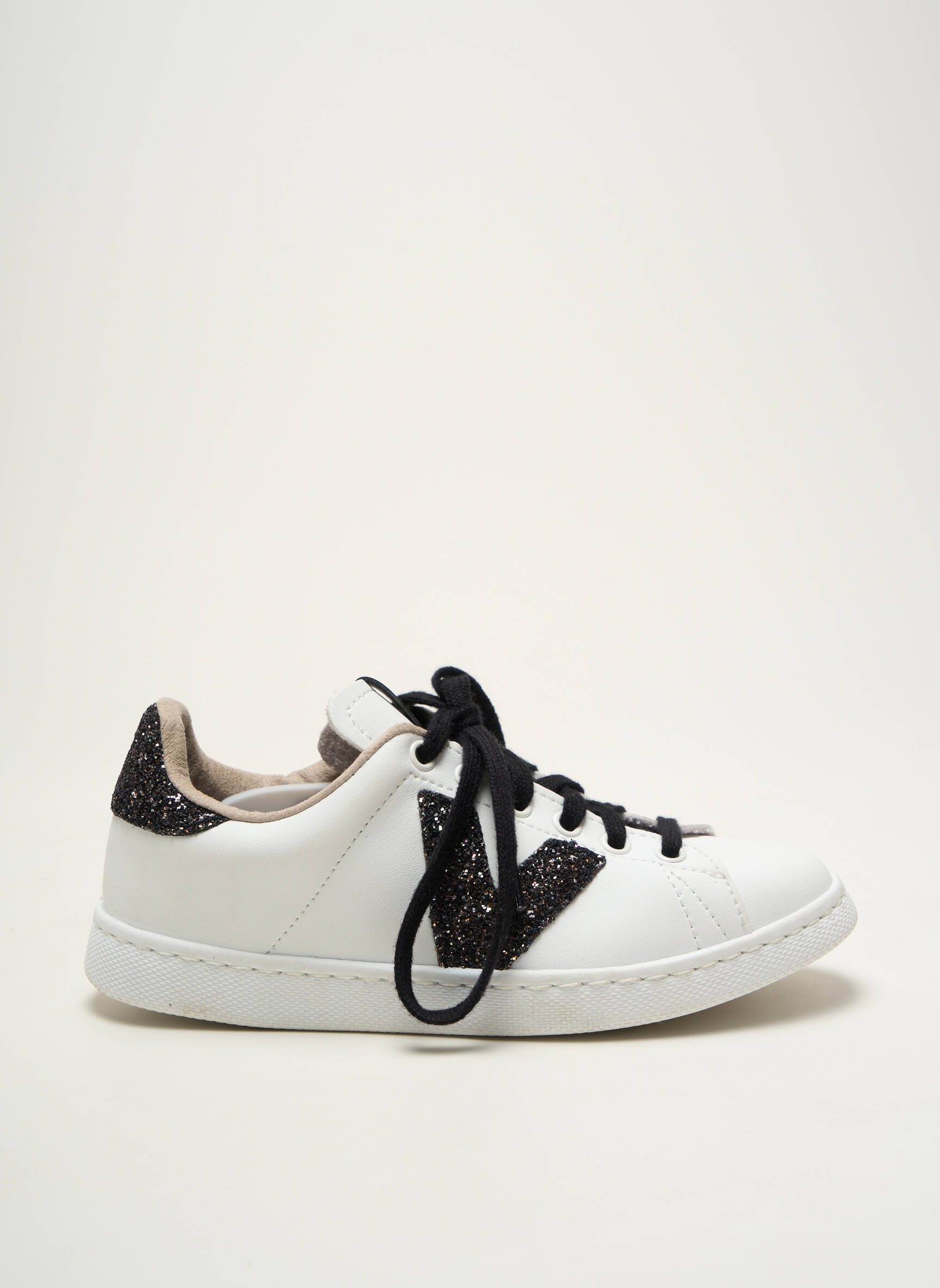 Voici une basket Victoria pour fille à prix mini, idéale pour allier style et économies au quotidien. Ce modèle blanc rehaussé de détails pailletés noirs sur le talon et le logo, apporte une touche tendance et lumineuse qui fera craquer les jeunes modeuses. Sa coupe épurée et ses lacets noirs assurent un look moderne tout en simplicité, parfait pour toutes les occasions, sans se ruiner.
