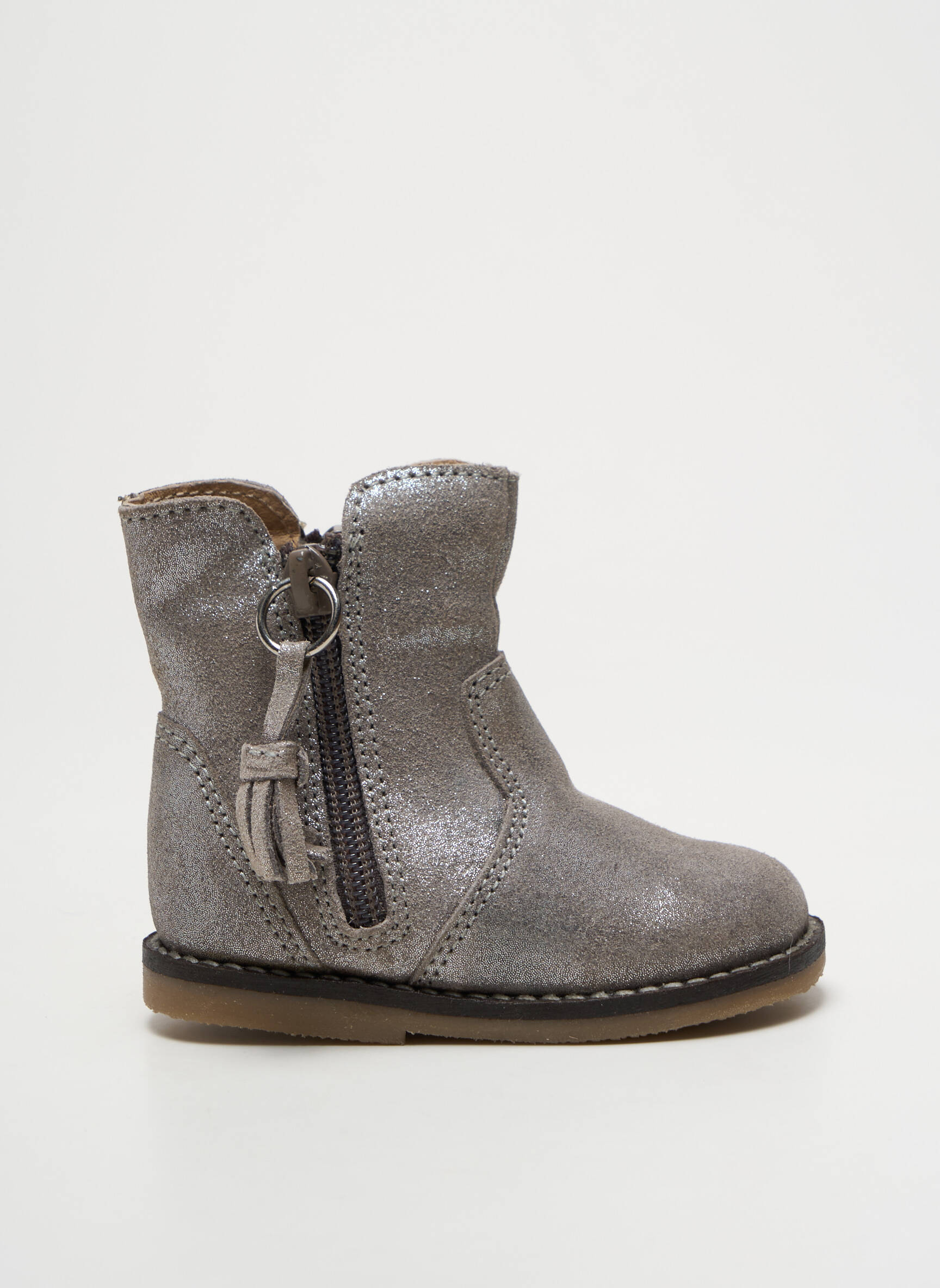 Profitez d’un bon plan en craquant pour ces bottines BOPY pour fille qui allient style et praticité à petit prix. Ce modèle argenté séduit par sa finition scintillante et ses détails soignés, comme la fermeture zippée rehaussée d'un petit pompon pour une touche ludique. La semelle souple offre un confort idéal au quotidien, parfait pour suivre toutes les aventures de votre enfant sans se ruiner.