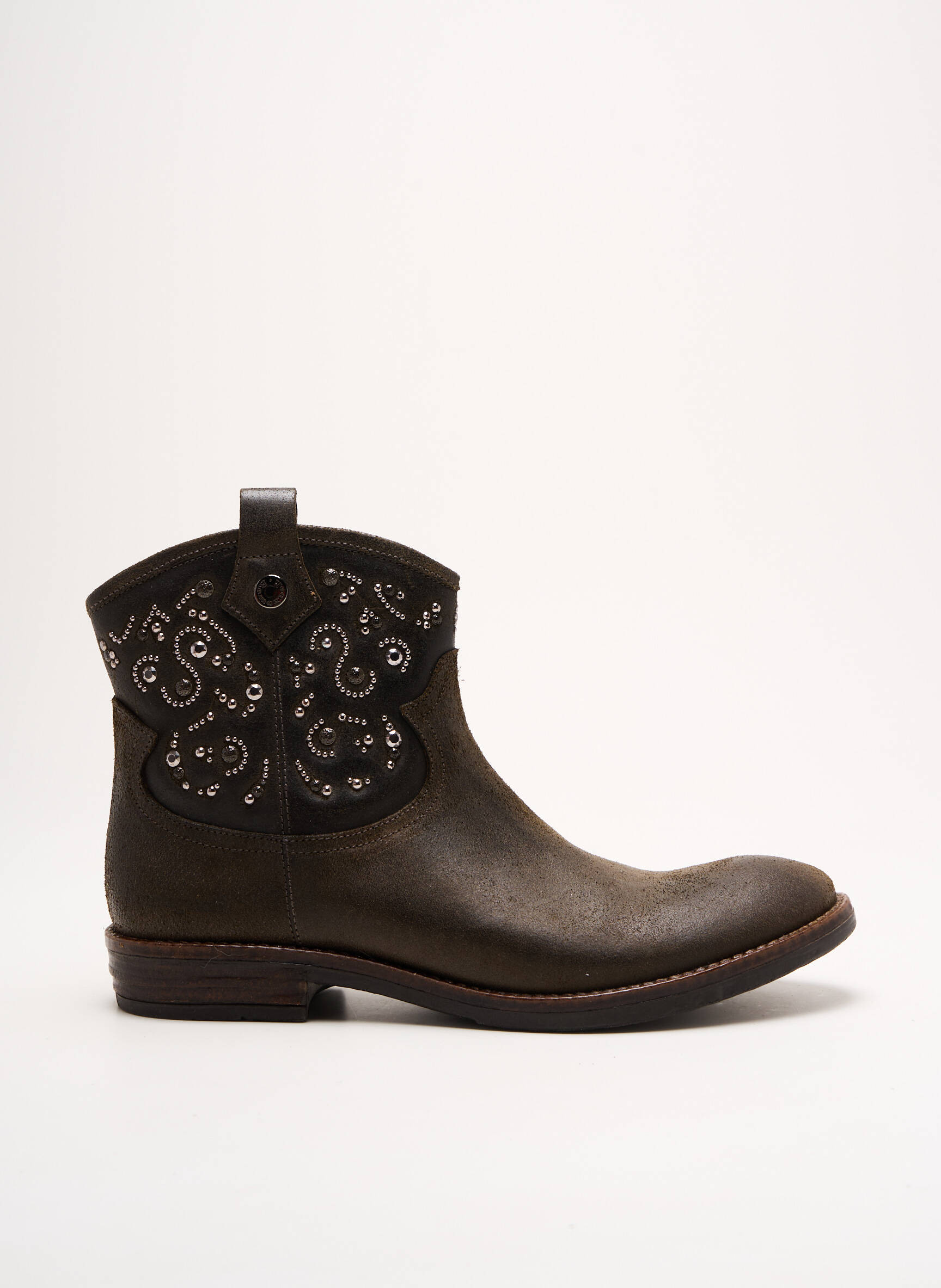 Osez l'allure rebelle avec ces bottines ROMAGNOLI qui marient à merveille esprit western et élégance contemporaine, sublimées par une peau légèrement patinée et un jeu délicat de clous argentés formant des arabesques raffinées sur la tige montante pour une touche de caractère subtile.