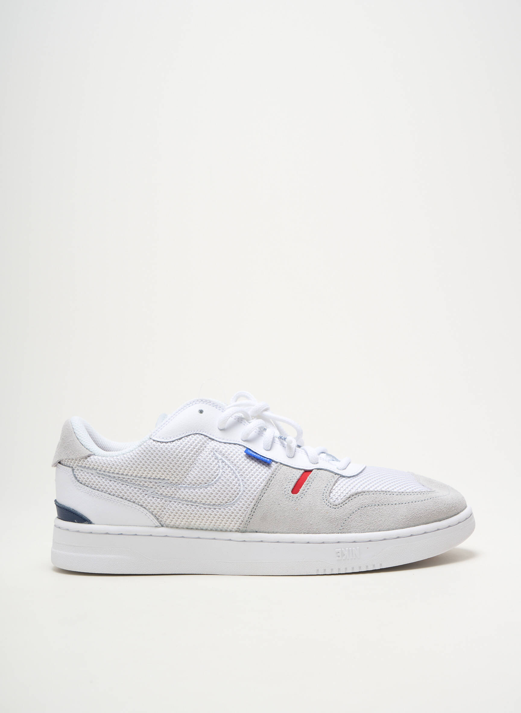 Profitez d’un véritable bon plan avec cette basket Nike pour homme, à petit prix, parfaite pour ceux qui recherchent style et économies. Son design épuré allie une base blanche lumineuse à des empiècements en suédine grise, tandis que les touches discrètes de bleu et de rouge apportent une note sportive et moderne. Polyvalente et confortable, cette basket s'adapte à toutes vos tenues du quotidien, offrant à la fois allure contemporaine et excellent rapport qualité-prix.