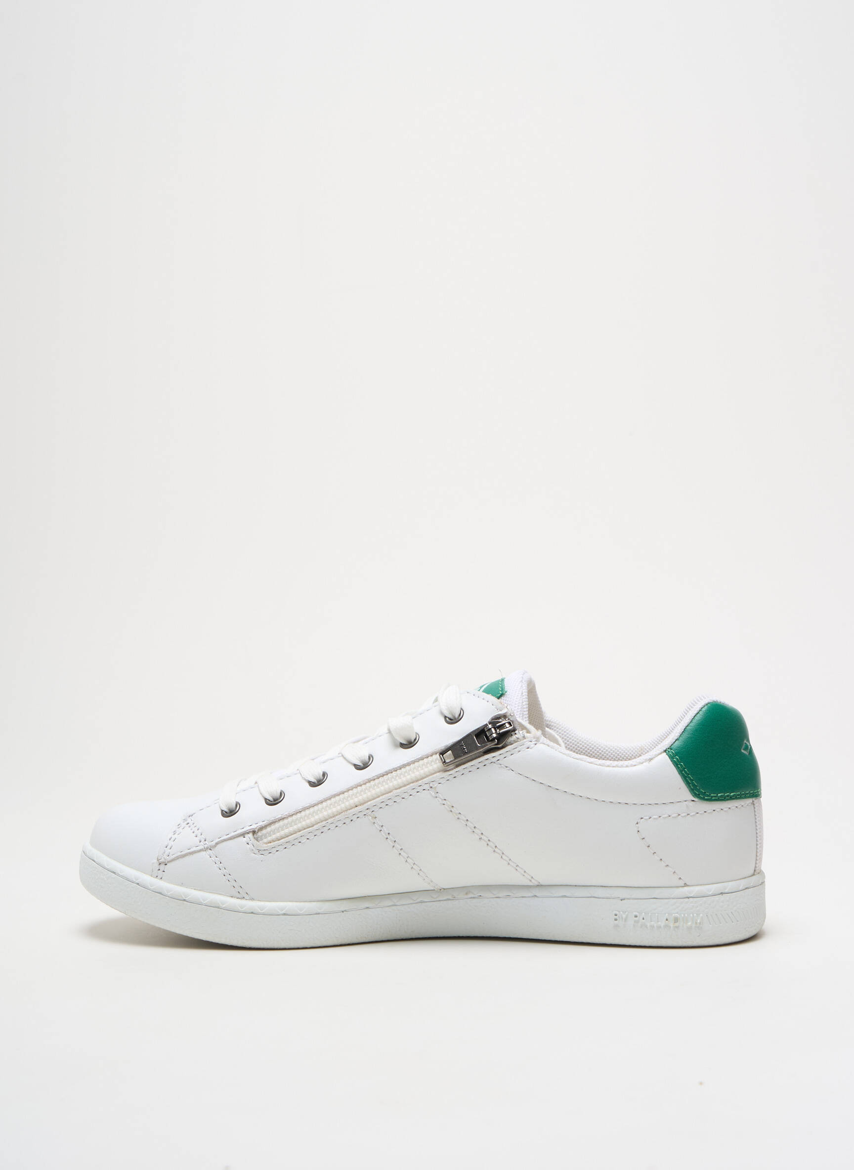 Osez la simplicité qui captive le regard avec ces baskets PALLADIUM pour homme, où le blanc éclatant s'allie à une fermeture éclair latérale argentée subtile, contrastée par un talon vert profond qui apporte une touche de caractère élégante à ce modèle à la fois moderne et épuré.