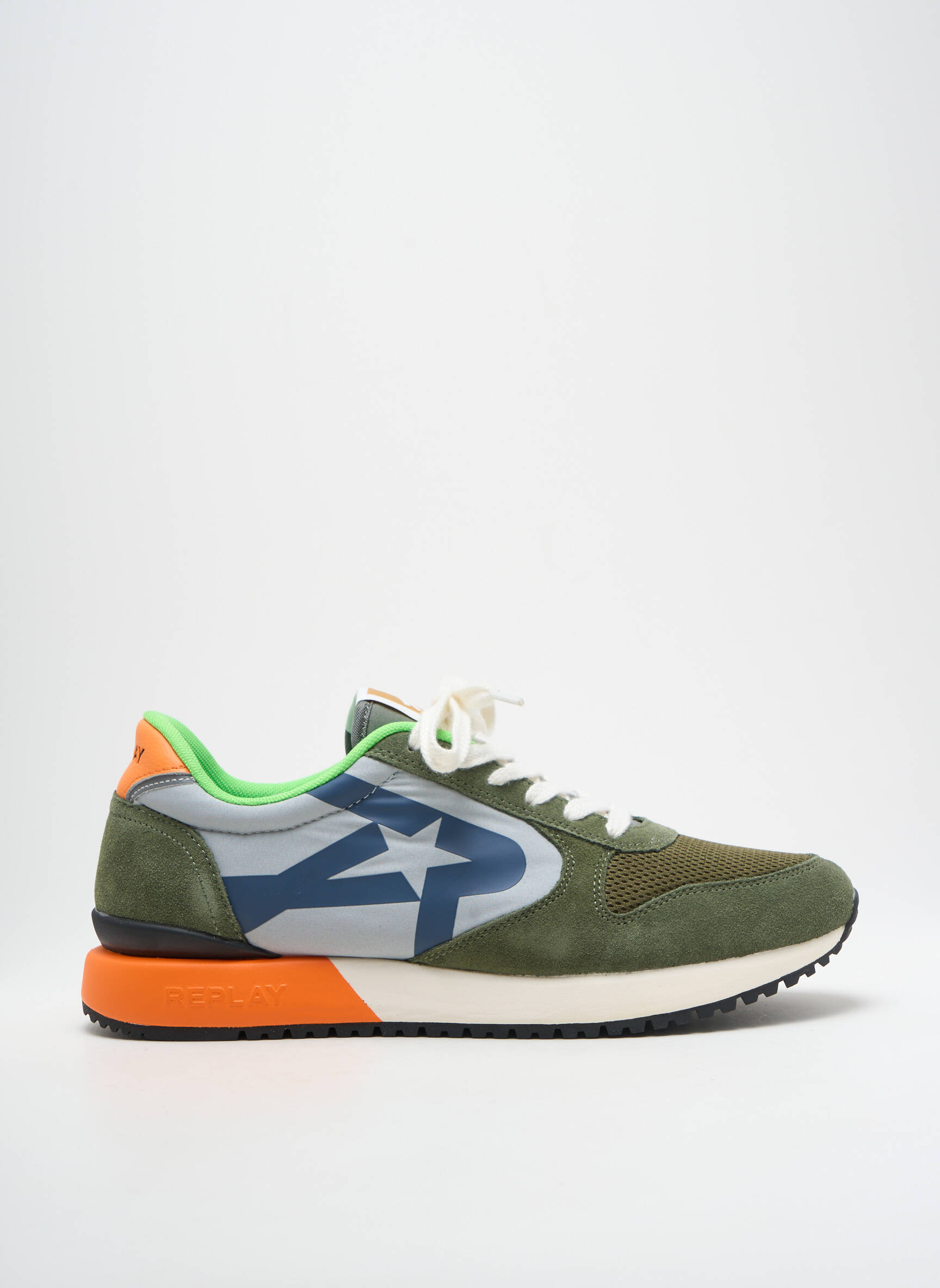 Profitez d’une vraie bonne affaire avec cette paire de baskets pour homme signée REPLAY, dont le design dynamique allie différentes nuances de vert et de gris, relevées par une touche d’orange vif au talon. Son logo étoilé et ses finitions modernes apportent une touche d’originalité, tandis que la semelle contrastée assure style et confort au quotidien. Idéales pour ceux qui veulent se faire plaisir sans se ruiner, ces baskets sont la solution parfaite pour renouveler votre look à prix malin.