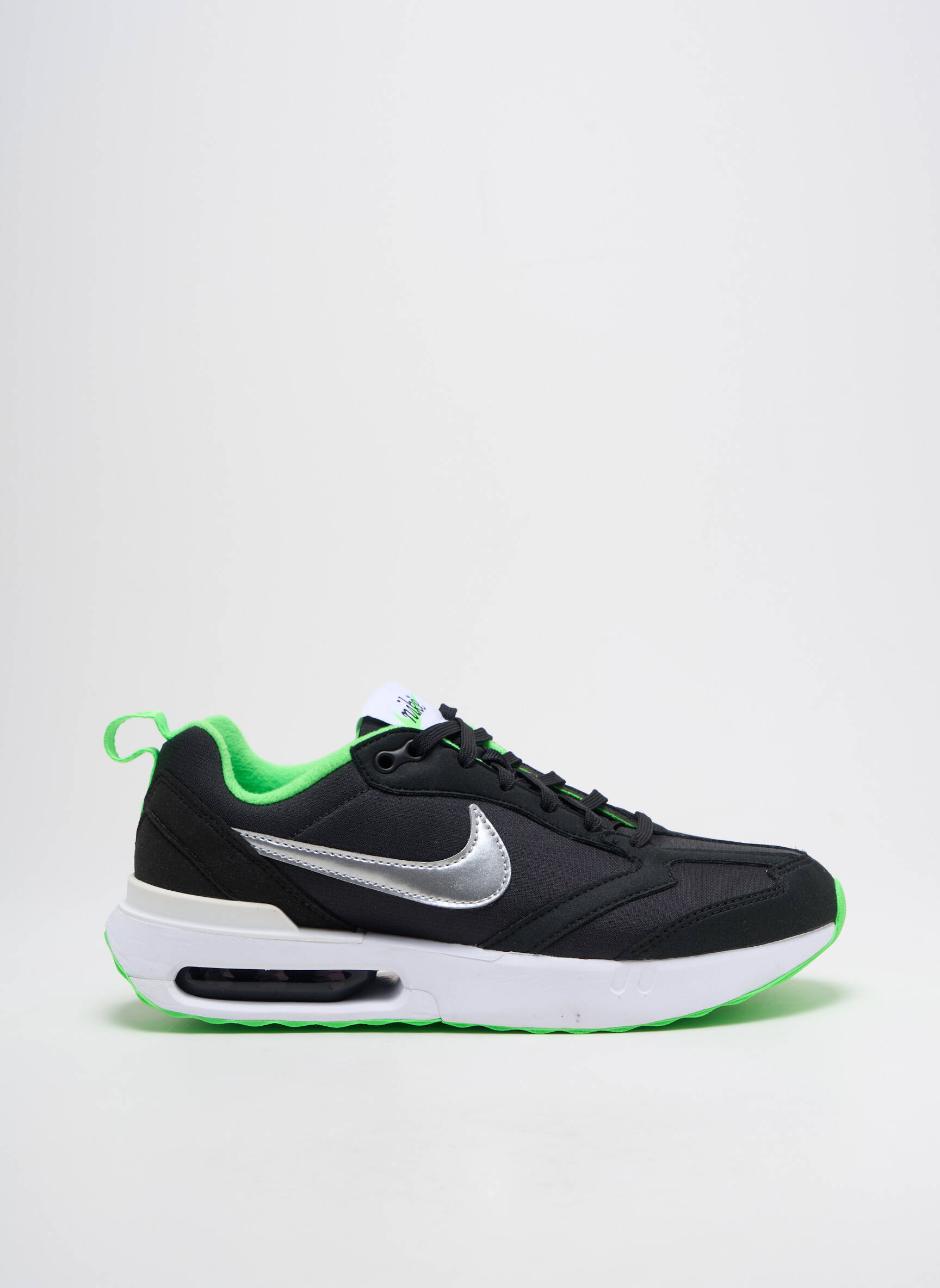 Profitez d’une paire de baskets NIKE tendance à prix tout doux grâce à notre offre destockage : ce modèle unisexe séduit par son look moderne, mêlant une toile noire élégante rehaussée par un swoosh argenté et des touches de vert fluo qui apportent une touche d’énergie. La semelle épaisse apporte un confort optimal au quotidien tout en affichant un style sport affirmé, idéal pour dynamiser toutes vos tenues à petit prix.