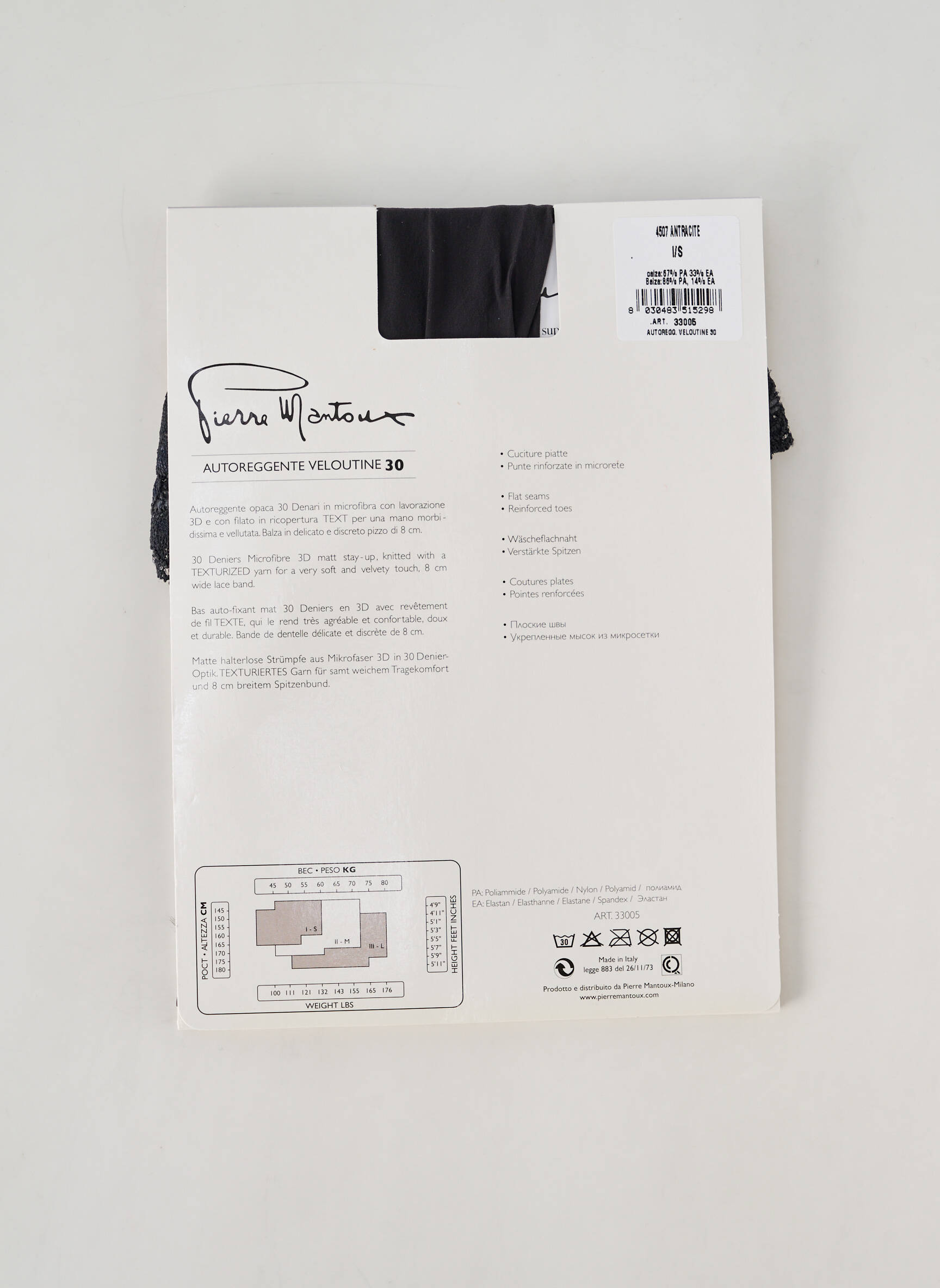 - Composition : 67 % Polyamide, 33 % Elasthane