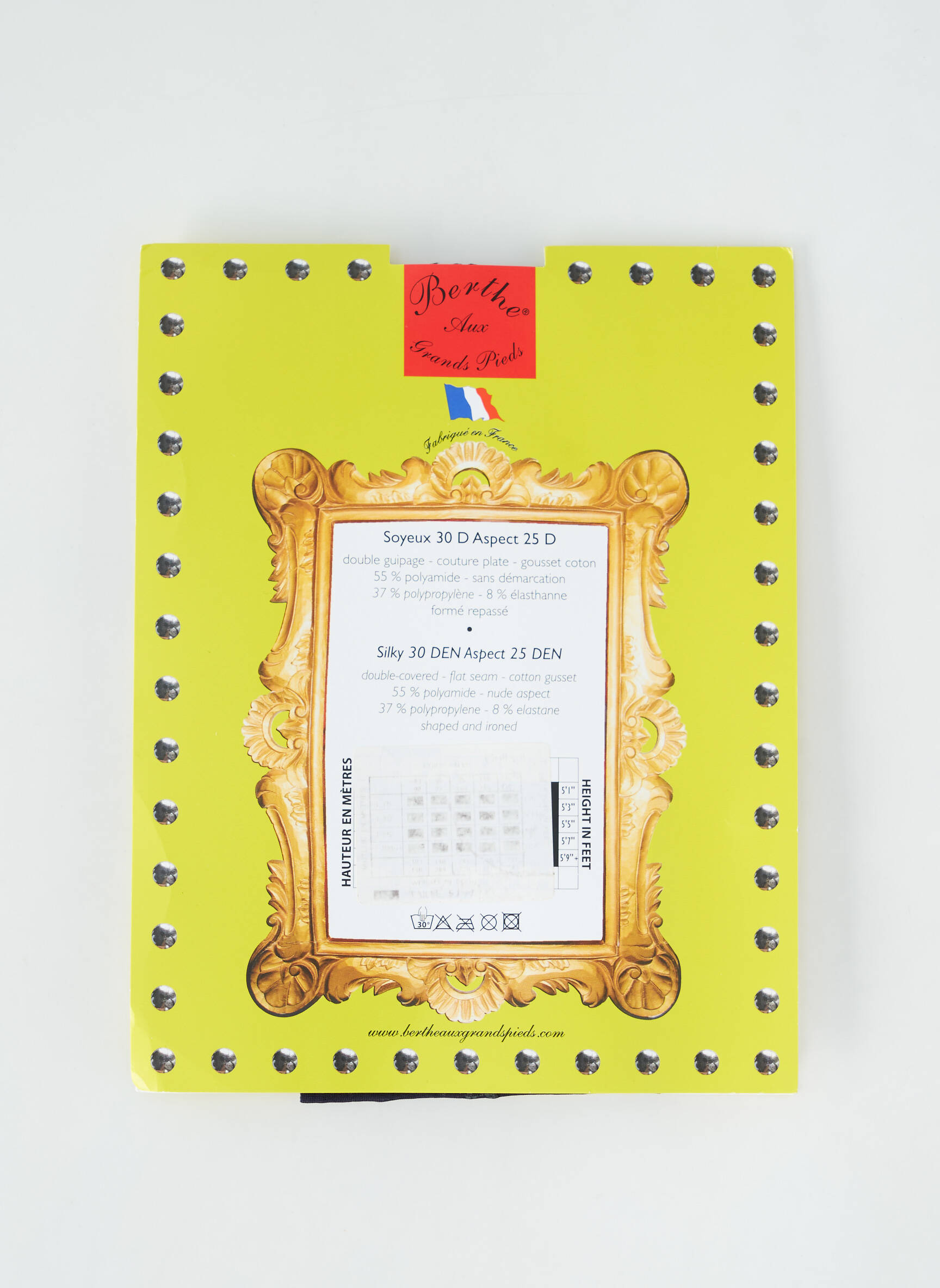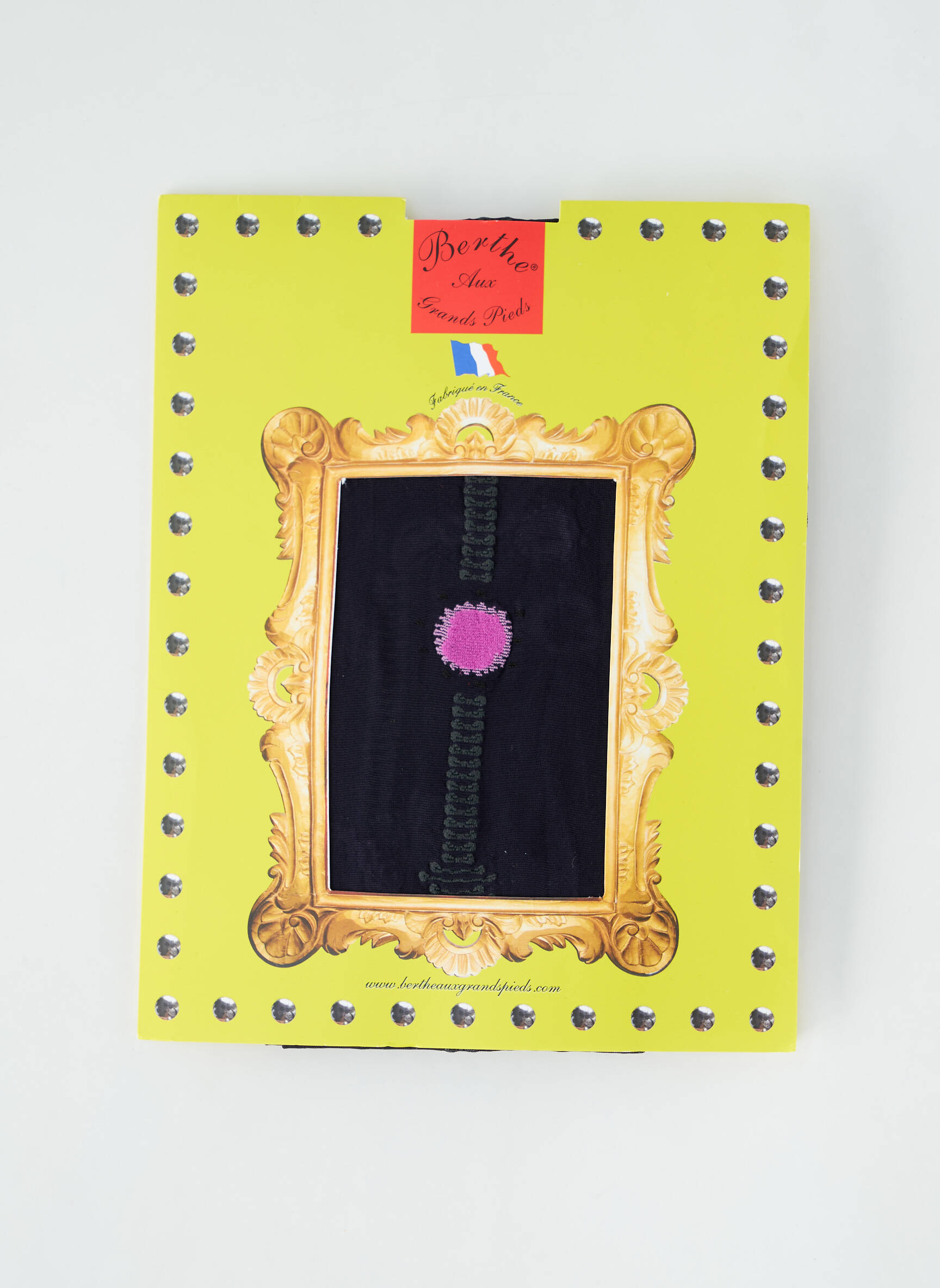 Profitez d’un bon plan incontournable avec ces collants pour femme signés Berthe aux Grands Pieds, un modèle original présenté dans un élégant coffret jaune orné d’un cadre doré, parfait pour s’offrir une touche de fantaisie à petit prix. Leur motif central travaillé et leur petit médaillon violet apportent une note chic et décalée à toutes vos tenues, tout en offrant le confort et la qualité que l’on attend d’une grande marque à prix réduit.
