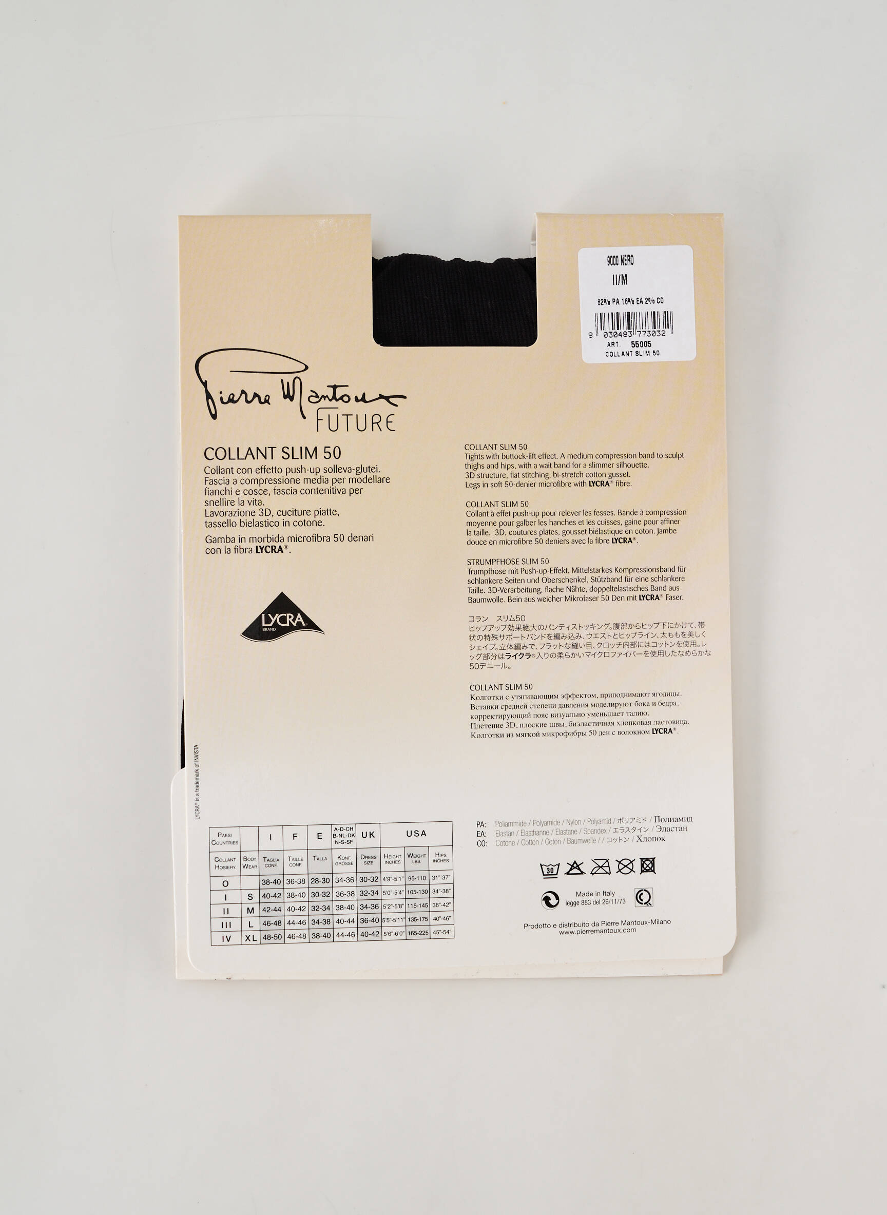 - Composition : 82 % Polyamide, 16 % Elasthane, 2 % Coton