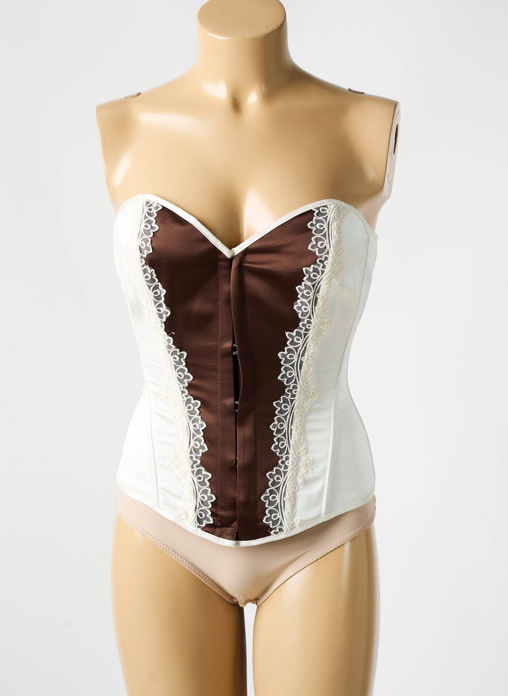 Profitez d’une véritable affaire avec ce corset signé REVANCHE DE LA FEMME, qui allie élégance et raffinement sans compromis sur le prix. Son design bicolore associe une base ivoire à un panneau central chocolat, rehaussé de délicats empiècements de dentelle blanche pour une touche de féminité irrésistible. Ce corset valorise parfaitement la silhouette tout en offrant un style chic à petit prix, idéal pour se faire plaisir sans se ruiner.