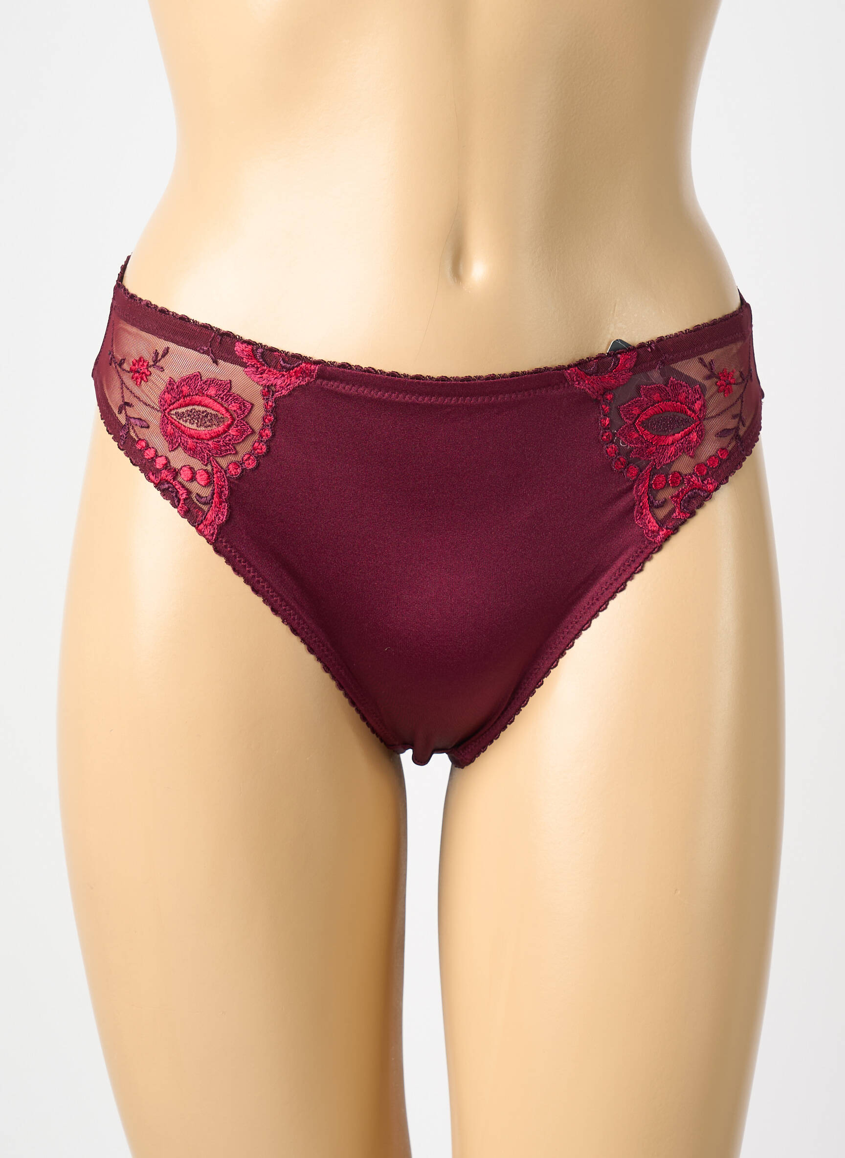 Profitez d’un bon plan irrésistible avec cette culotte femme CONTURELLE à prix déstocké, qui allie élégance et raffinement grâce à son coloris bordeaux profond et ses délicats empiècements de tulle brodé sur les côtés, pour un effet à la fois chic et romantique sans compromis sur le confort au quotidien.