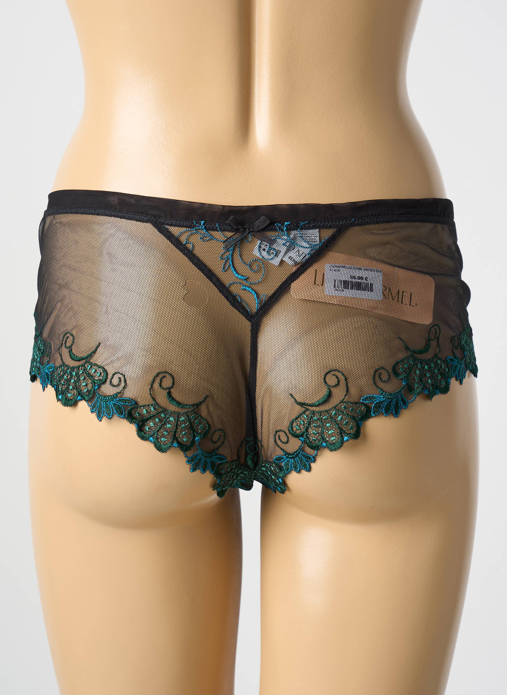 Imaginez un secret glamour délicatement posé sur votre peau : ce shorty signé Lise Charmel marie avec audace la transparence d’un tulle noir aux broderies florales vert émeraude d’une finesse exquise, soulignant subtilement les courbes tout en offrant une élégance infinie.