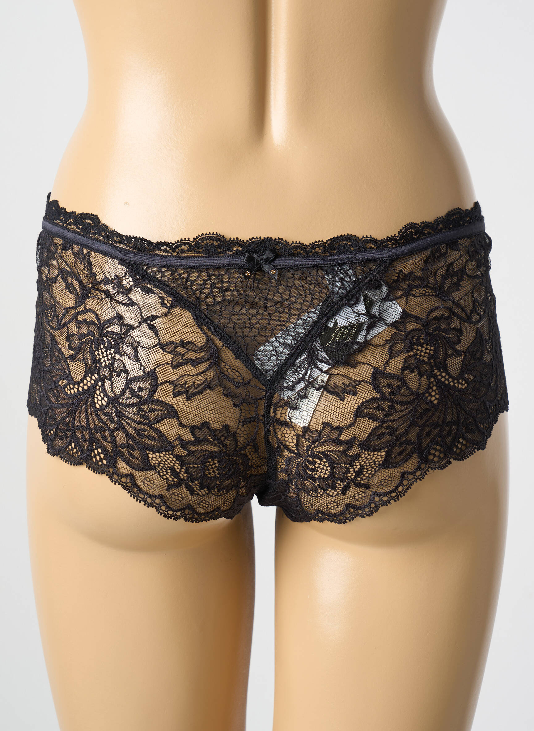 Il est rare qu’un shorty devienne une véritable œuvre d’art délicate et sensuelle, mais celui-ci de Lise Charmel y parvient avec une élégance troublante. Ce modèle en dentelle noire aux motifs floraux dévoile subtilement la peau grâce à sa transparence savamment dosée, soulignée par une taille basse agrémentée d’une bordure délicatement festonnée qui épouse parfaitement les courbes féminines en offrant confort et raffinement.