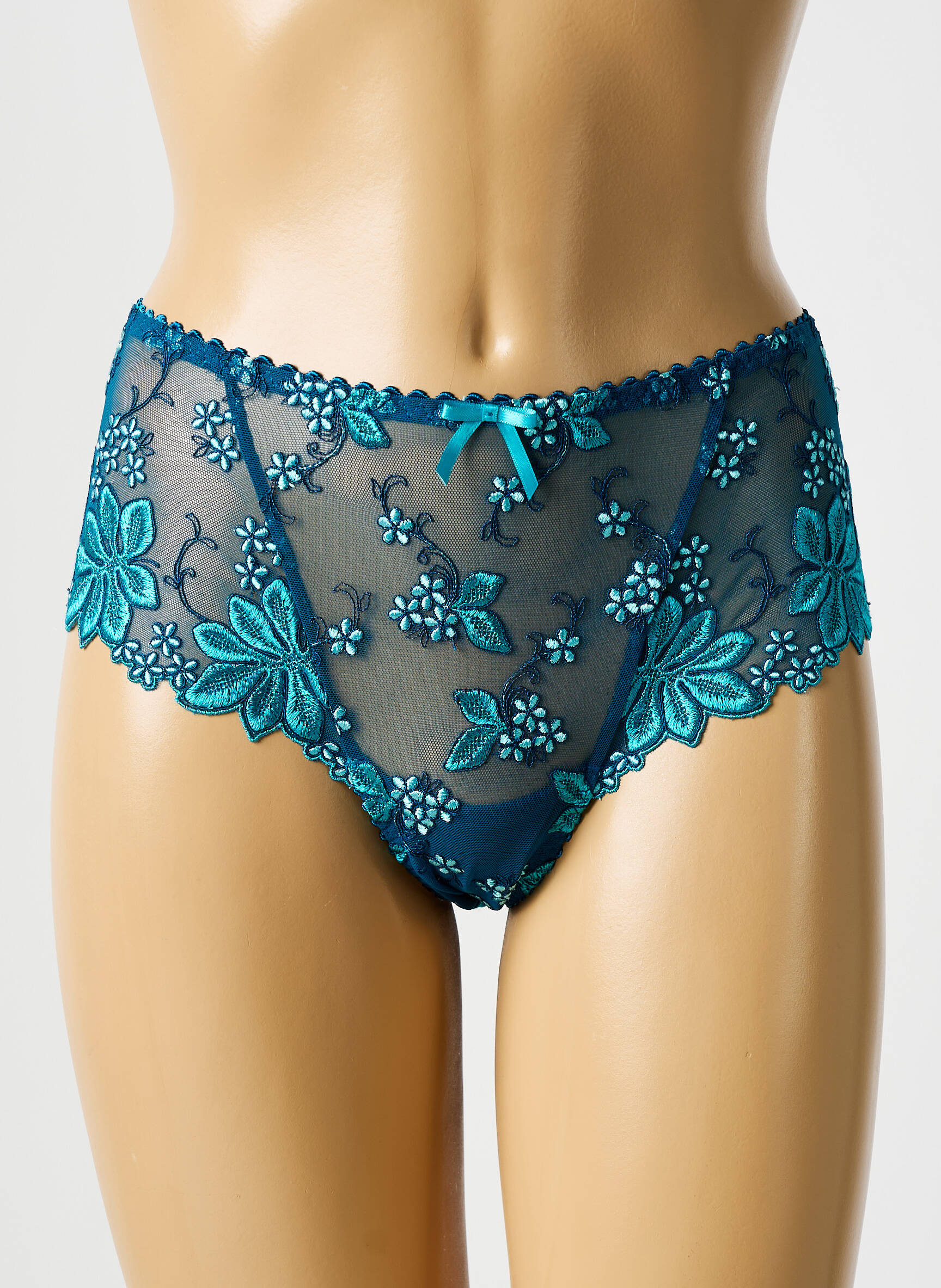 Craquez pour ce shorty PRIMA DONNA pour femme, une pièce raffinée à petit prix qui allie élégance et confort, grâce à sa dentelle transparente délicatement brodée de fleurs turquoise et son petit nœud décoratif à la taille, parfait pour apporter une touche chic à votre lingerie tout en réalisant une belle économie.
