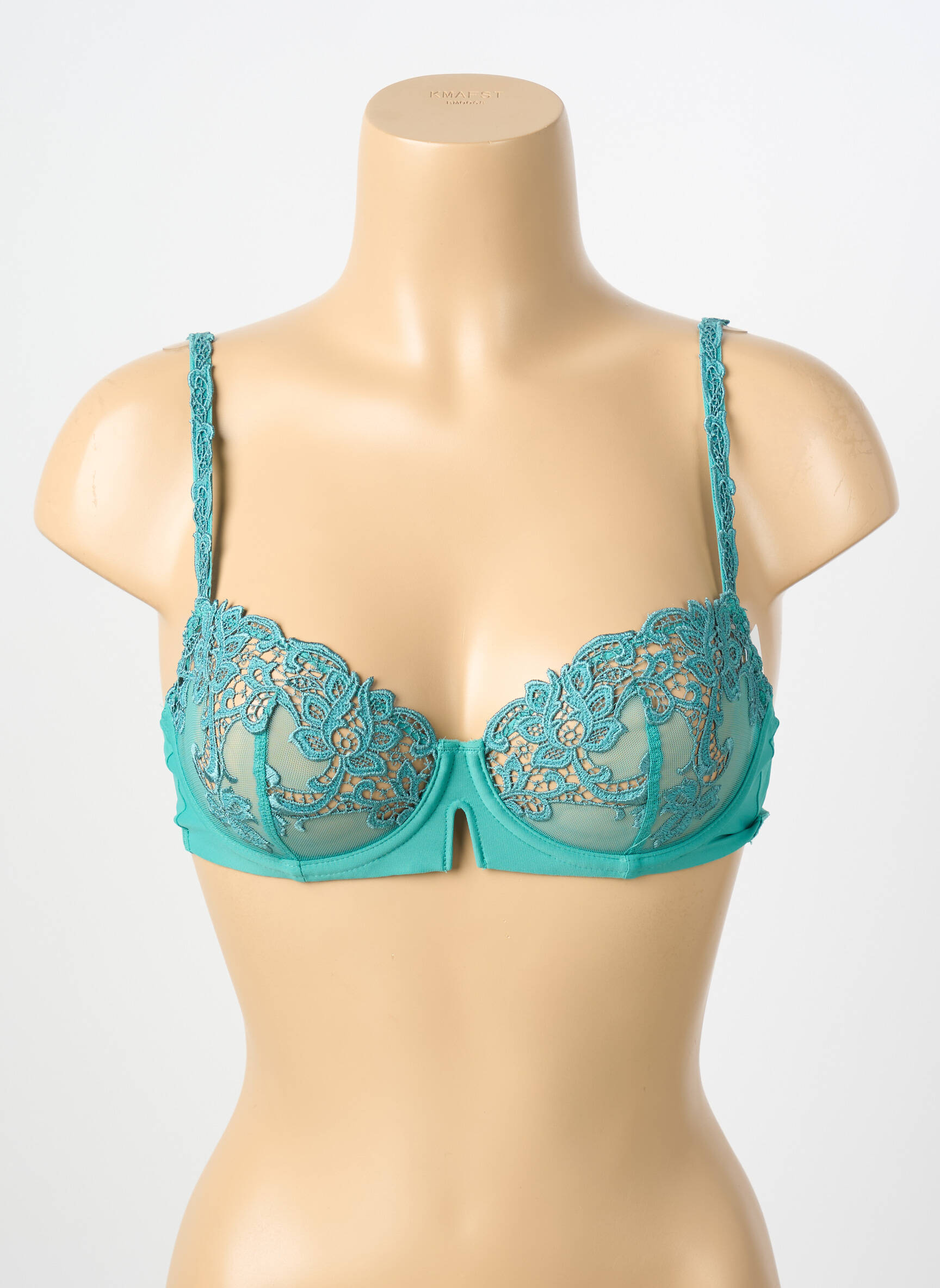 Offrez-vous une pièce de lingerie raffinée à prix mini avec ce sublime soutien-gorge Simone Pérèle qui séduit par son délicat jeu de transparence et ses superbes broderies florales turquoise, parfait pour allier élégance et confort sans vous ruiner.