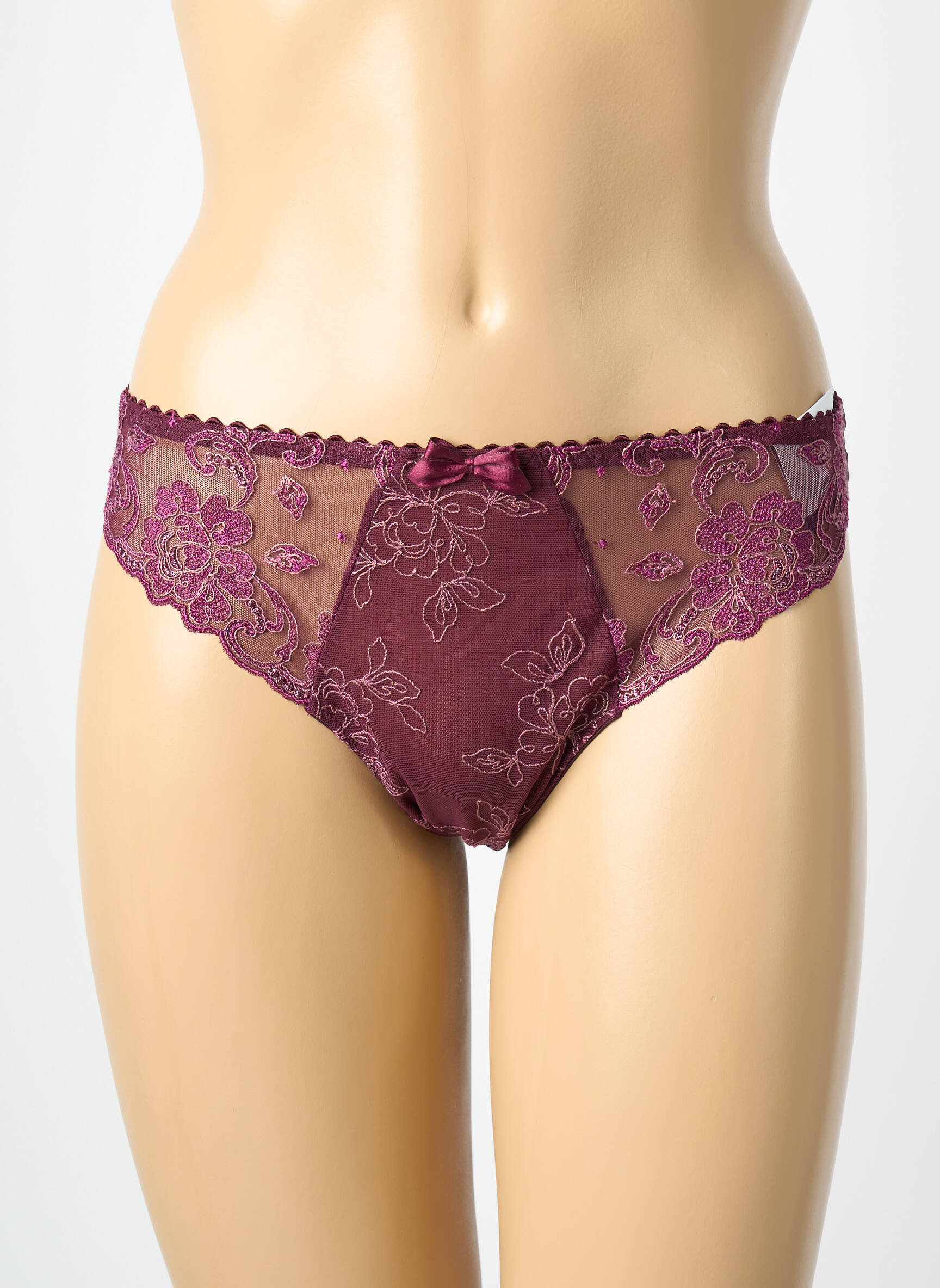 Profitez d’une offre irrésistible avec ce tanga PRIMA DONNA pour femme, qui allie raffinement et prix mini pour se faire plaisir sans se ruiner. Sa délicate dentelle florale prune, rehaussée par une petite touche de tulle transparent et un nœud satiné à la taille, apporte une note élégante et féminine, parfaite pour sublimer votre quotidien avec une lingerie chic à petit prix.