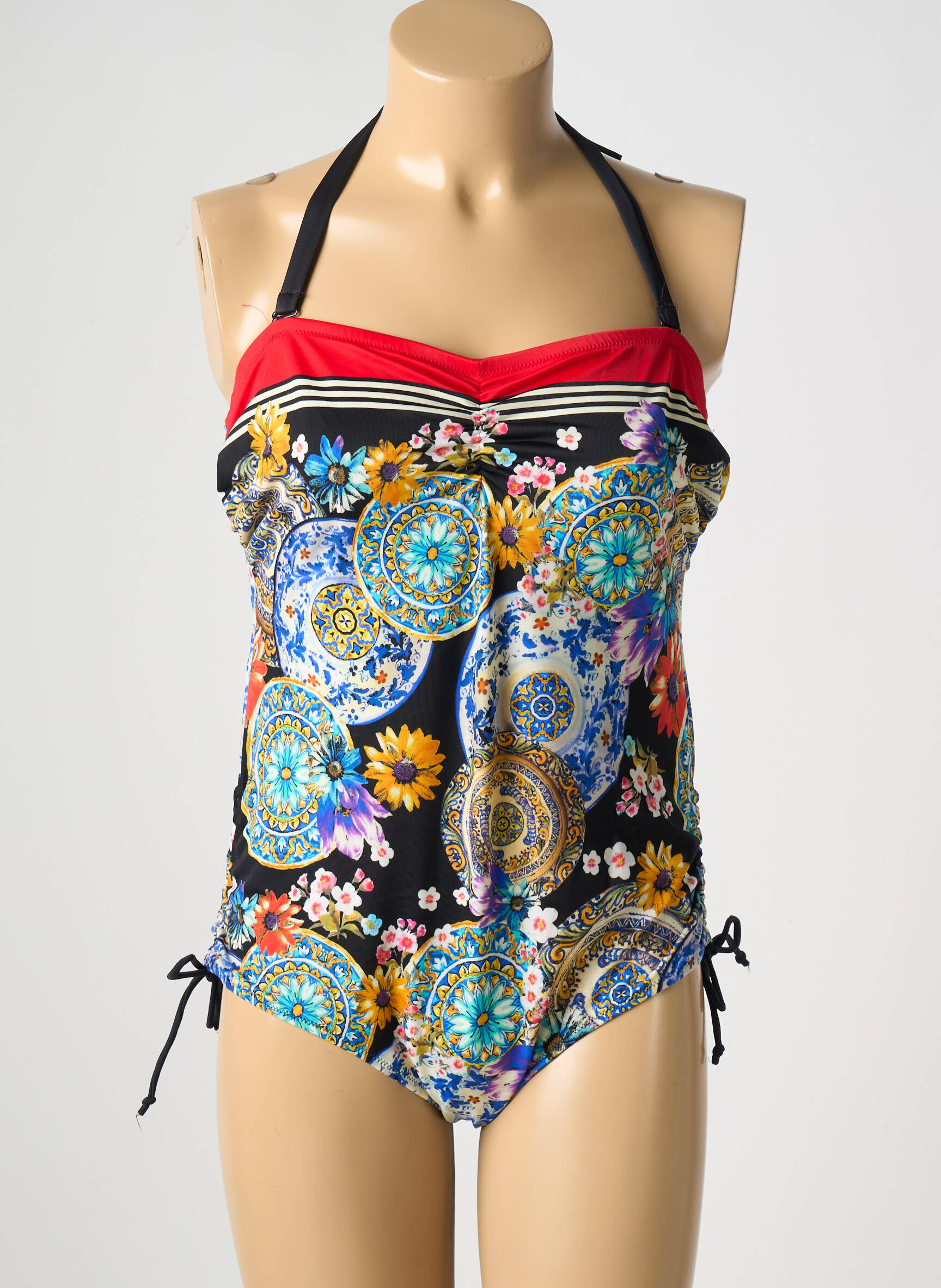 Craquez pour ce maillot de bain 1 pièce de la marque !OHO! qui vous offre un style chic à petit prix, avec son haut bandeau de couleur rouge et ses motifs floraux colorés façon mandala sur fond noir qui apportent une touche originale et éclatante à vos journées à la plage ou à la piscine. Idéal pour celles qui souhaitent se faire plaisir sans se ruiner, ce modèle mettra en valeur votre silhouette grâce à sa forme féminine et ses liens réglables sur les côtés.