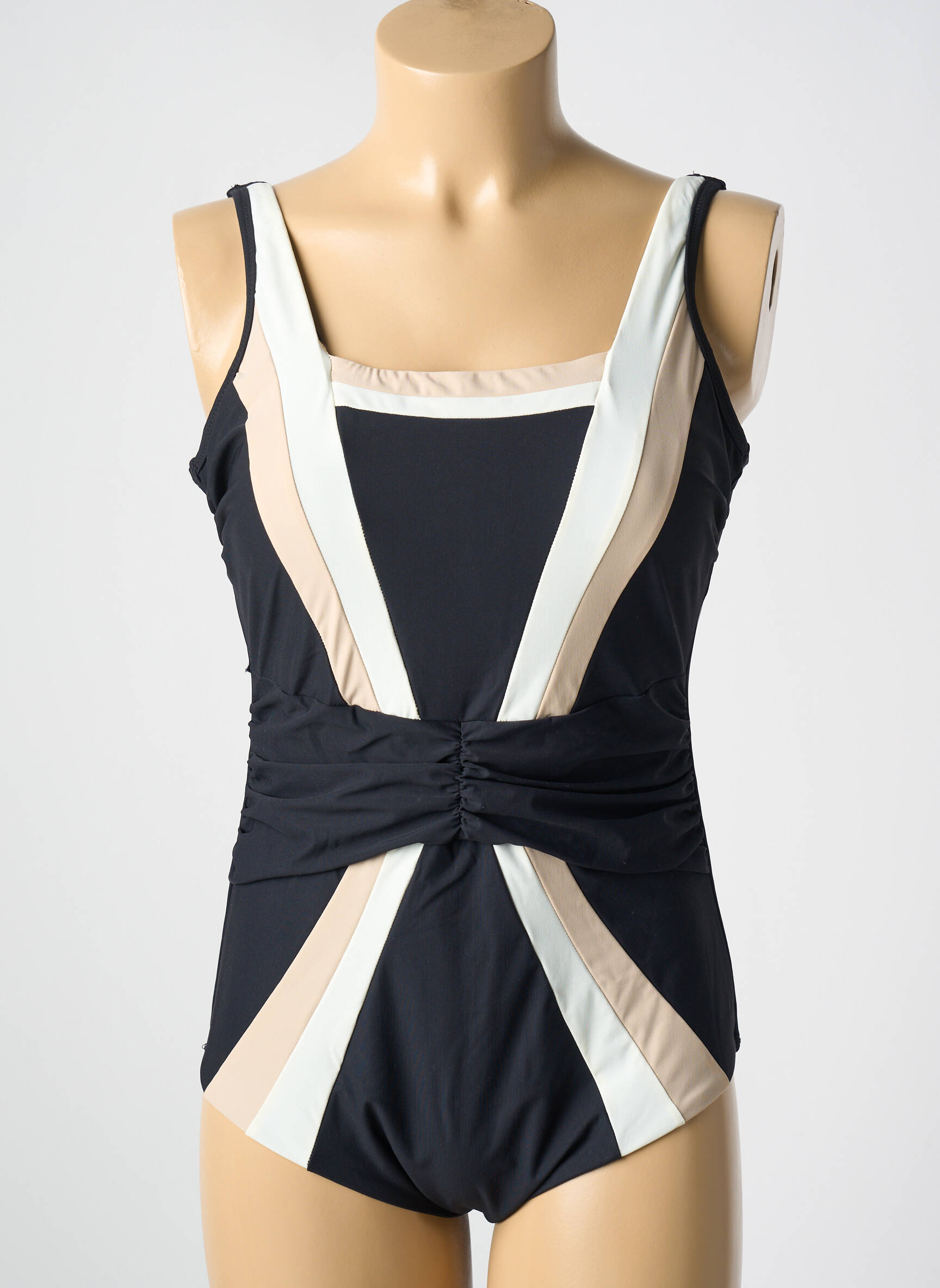 Imaginez un maillot de bain qui joue avec les lignes et les contrastes pour sublimer votre silhouette avec élégance. Ce modèle une pièce signé MIRADONNA associe un noir profond à des bandes beiges et blanches judicieusement placées, qui dessinent et affinent visuellement la taille grâce à un effet de couture froncée centralisée. Les larges bretelles et l'encolure carrée apportent une touche de modernité tout en assurant un maintien confortable, faisant de ce maillot un choix raffiné et flatteur pour vos moments au bord de l'eau.