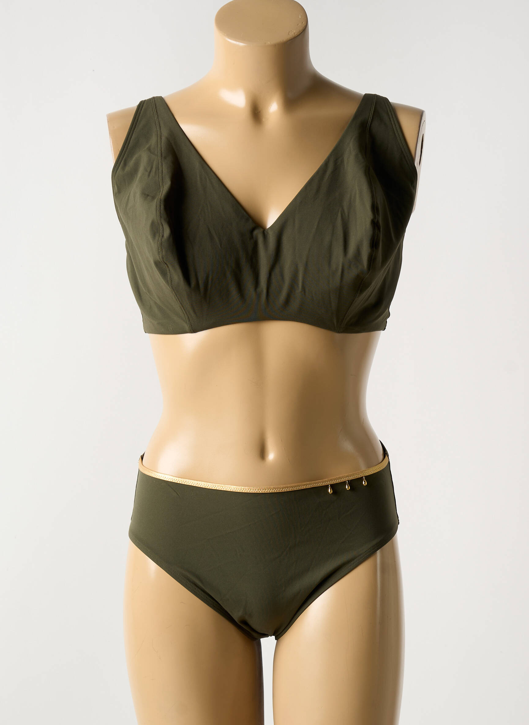 Profitez d’un bon plan avec ce maillot de bain deux pièces de la marque Empreinte, proposé à petit prix pour allier élégance et économie. Son coloris kaki tendance met en valeur toutes les silhouettes, tandis que la forme féminine du haut assure un excellent maintien tout en restant confortable. Sa culotte taille mi-haute, rehaussée de petits boutons dorés, apporte une touche chic et originale pour un look raffiné sur la plage comme à la piscine. C’est l’occasion parfaite de s’offrir un maillot de créateur à prix doux sans compromis sur le style.