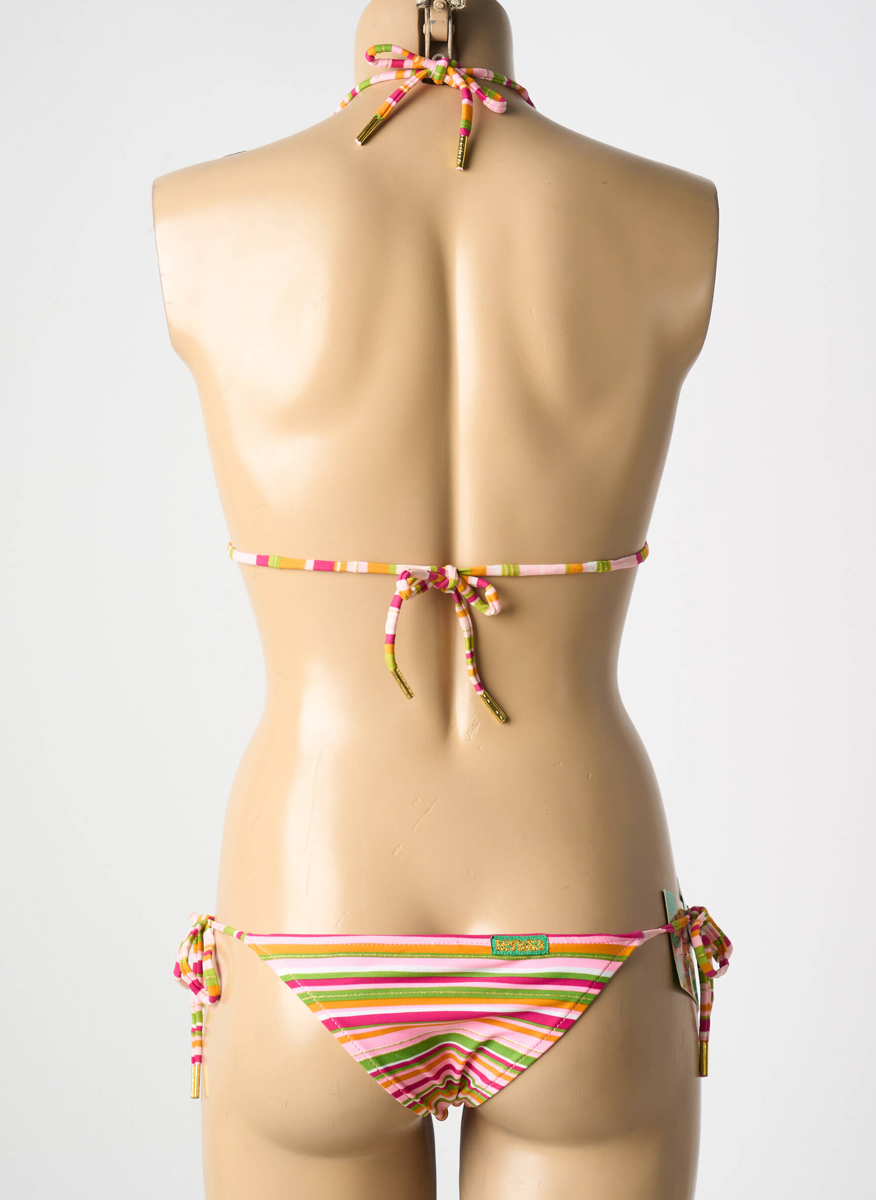 Profitez d’un bon plan sur ce maillot de bain 2 pièces de la marque LENITA CANARIAS CHOICE, parfait pour ajouter une touche de pep’s à vos journées plage sans vous ruiner. Son imprimé rayé multicolore offre un look frais et tendance, tandis que le haut triangle et la culotte à nouer sur les côtés mettent en valeur la silhouette avec une allure décontractée. Ce modèle combine style et petit prix, idéal pour renouveler votre garde-robe balnéaire à moindre coût.