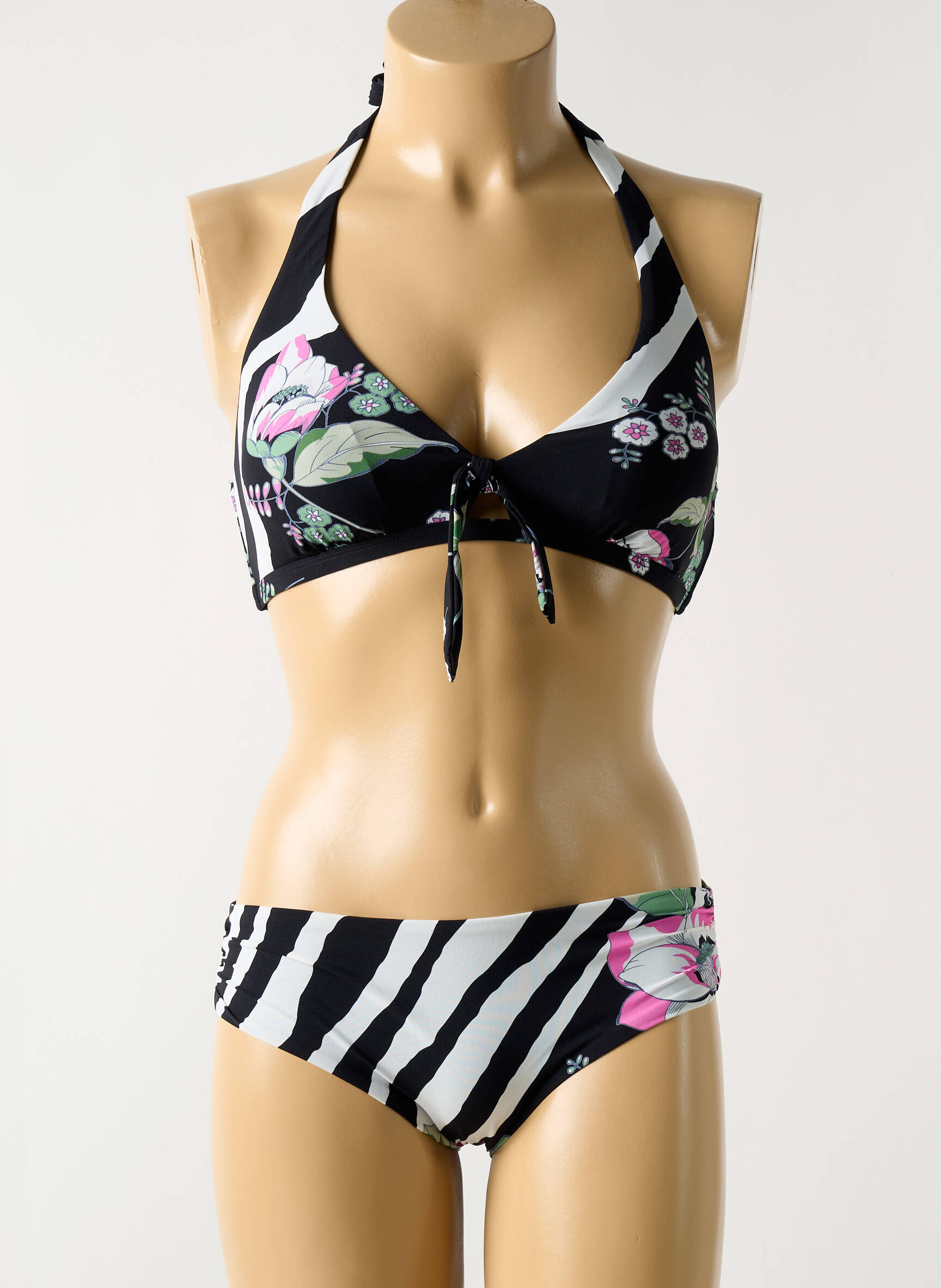 Et si votre été commençait avec un maillot de bain aussi audacieux que raffiné ? Ce modèle deux pièces de MIRADONNA combine un haut effet push-up à col halter qui sublime le décolleté grâce à un subtil jeu de liens ajustables, avec un bas à la coupe classique décontractée. La dominante noire est énergisée par un imprimé floral délicat mêlé à des rayures graphiques qui apportent une touche d’originalité et de dynamisme. Parfait pour une femme qui aime allier élégance et modernité au bord de l’eau.