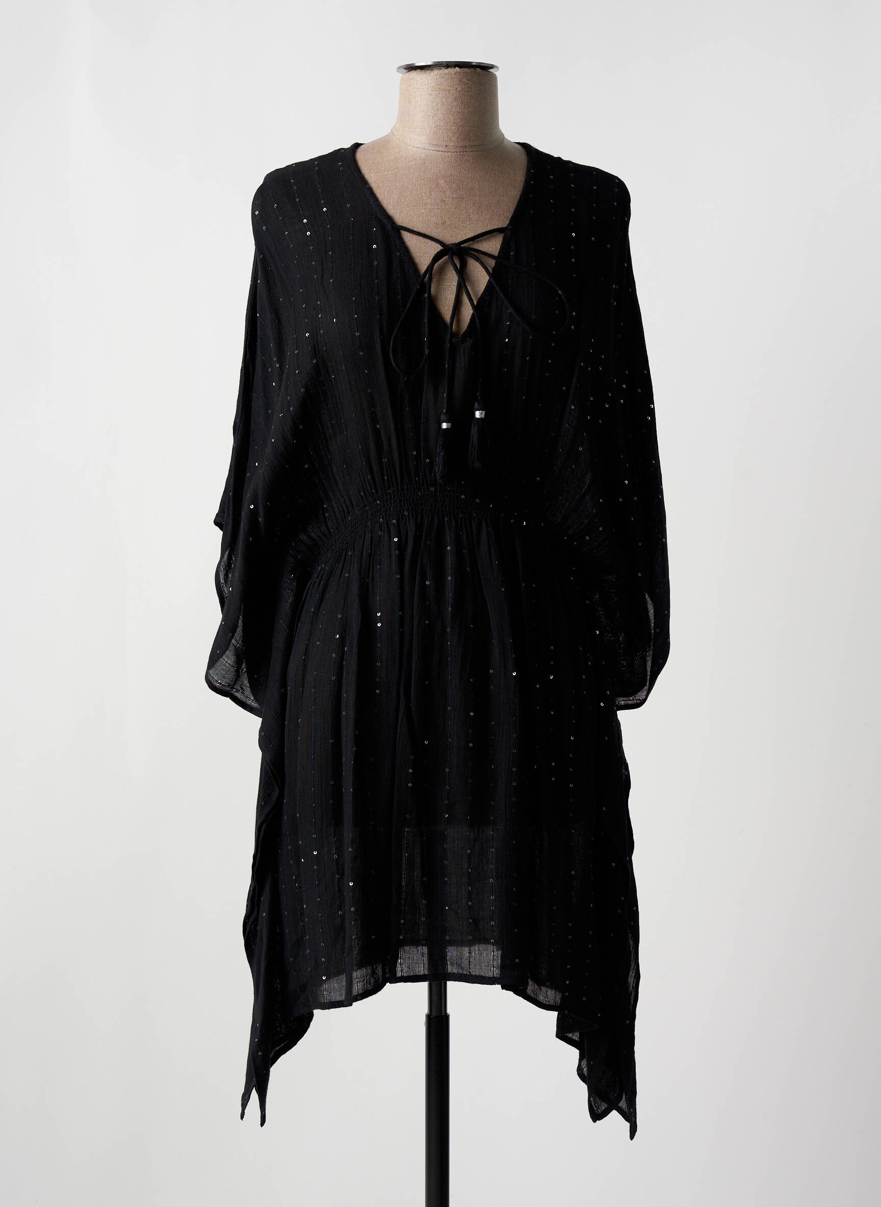 Imaginez une robe de plage qui capture la magie d'une nuit étoilée, c’est exactement ce que propose ce modèle signé AMORESSA. Ce vêtement fluide et léger s’enveloppe d’un tissu noir finement parsemé de petites touches scintillantes qui évoquent des constellations discrètes. Sa coupe évasée, soulignée par une taille légèrement cintrée, met en valeur la silhouette avec élégance tout en garantissant un confort absolu. Le décolleté en V se démarque par un jeu de liens à nouer délicatement ornés de perles, apportant une touche de féminité raffinée. Les manches longues, aériennes et fluides, complètent ce look à la fois mystérieux et délicieusement bohème, idéal pour se balader au bord de l'eau ou pour une soirée estivale improvisée.