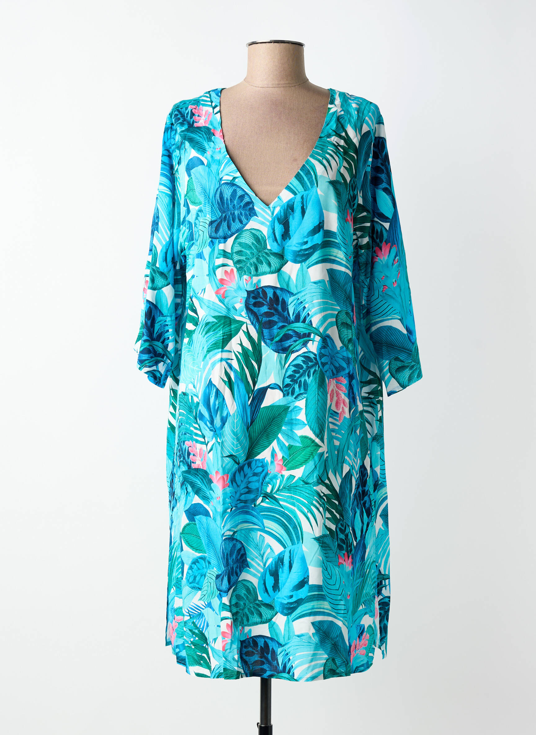 Profitez des petits prix pour vous offrir cette robe de plage ANITA au motif tropical éclatant qui invite à l’évasion. Son imprimé feuillage et ses teintes de bleu vous promettent une allure fraîche et décontractée, idéale pour vos journées en bord de mer ou au bord de la piscine. Avec son col en V et ses manches amples, elle assure un tombé fluide et confortable tout en mettant en valeur votre silhouette, le tout à prix doux pour un style estival sans se ruiner.
