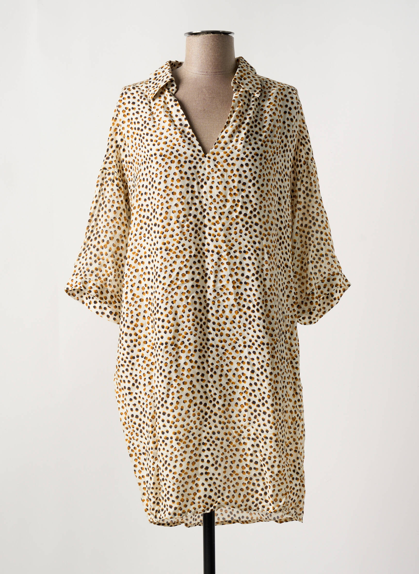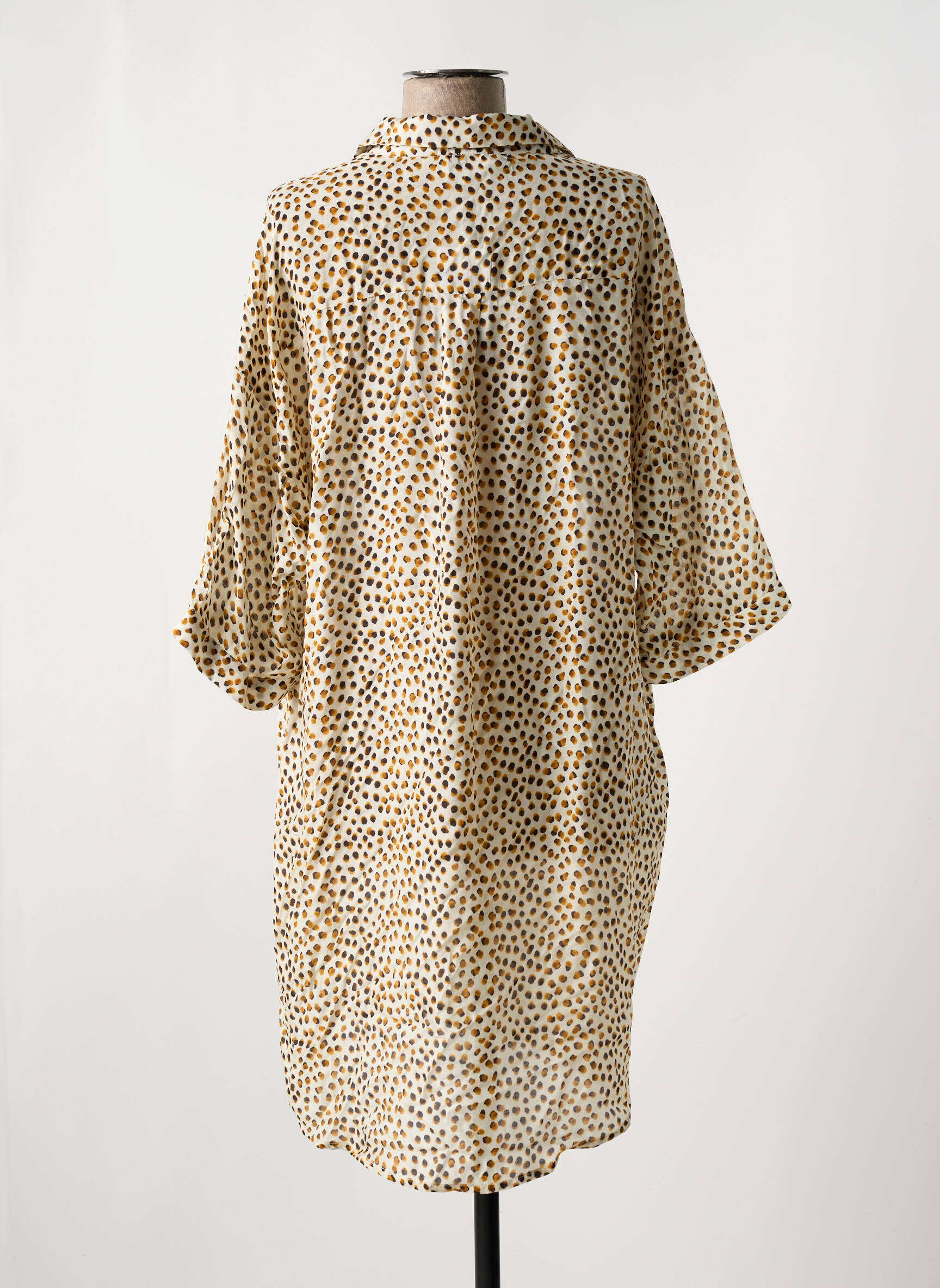 Imaginez un souffle léger d'été capturé dans une robe : cette pièce signée CYELL dévoile un imprimé délicat de petits pois aux nuances chaleureuses sur un fond crème, enveloppant la silhouette avec sa coupe ample et décontractée. La robe invite à la détente avec son col chemise légèrement ouvert et ses manches trois-quarts volumineuses, parfaites pour une journée au bord de la mer où confort et élégance se rencontrent sans effort.